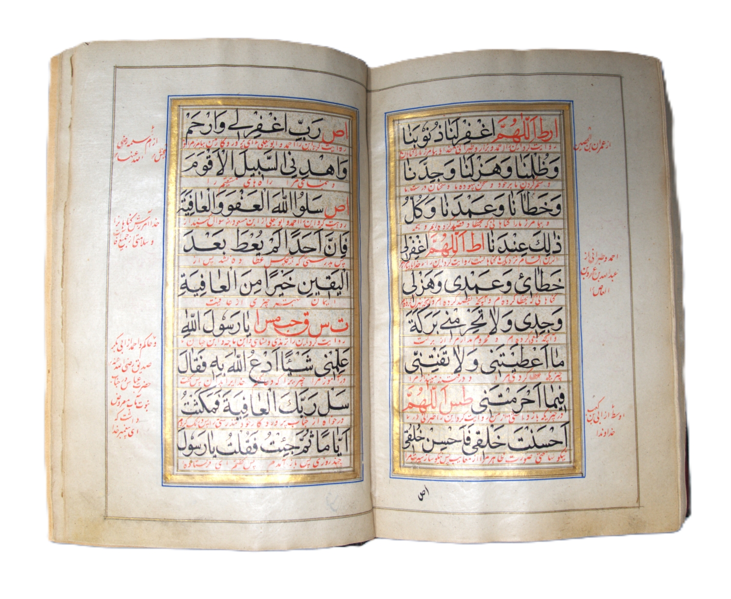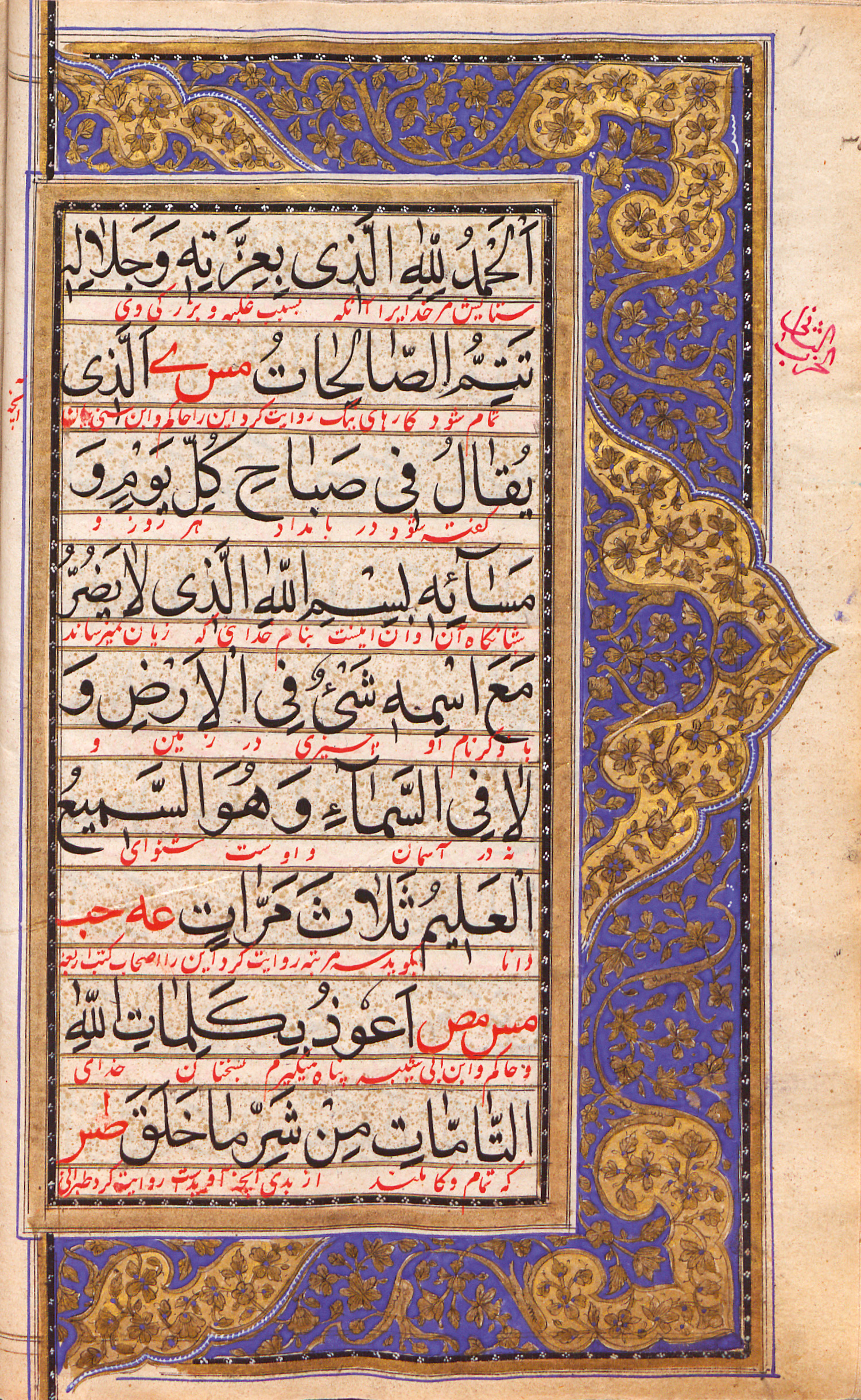 Während der mystisch-heiligen Urtexte in hoher aufrecht gezogener, minimal nach links kippender schwarzen Kalligraphie im Naskhi-Duktus und mit Auszeichnungen in Rot, etwa für den Gottesnamen "Allah", "Der Mächtigste", "Der Allerbarmer" etc., geschrieben wurde, sind in den schmaleren Zeilen dazwischen - jeweils unter dem arabischen Urtext - Übersetzungen in Farsi im Nastaliq-Duktus. Die Textanlage mit den interlinearen Übersetzungen ist typisch für die Koranschulen und Schreiberwerkstätten in Isfahan oder Shiraz, teils auch in Teheran, in der Übergangszeit vom späten Safawiden- zum Qajar-Reich (18. und 19. Jahrhundert). Die Künstler der Kitabkhana (Werkstätten bzw. Schreiberateliers) zeichneten sich nicht nur durch eine Rückbesinnung auf klassische Stile, sondern auch durch neue, phantasievolle Ornamente aus, die ganz besonders minutiös und nuanciert ausgearbeitet waren, so daß Koran- und Gebetshandschriften entstanden, die für die reiche Mittel- und Oberschicht, den Hof und wohlhabende Händler gedacht waren. – Nur leichte Handhabungsspuren, der erste Ziertitel mit kleinen Knitterspuren und sauberer Randansetzung, sonst kaum Randläsuren, gelegentlich etwas stock- und braunfleckig. Vorsätze mit arabischen Annotationen von alter Hand. Vereinzelt auch im Textblock Randkommentare in Rot. Mit wenigen hinterlegten Randläsuren und kleinen Randausbrüchen. Insgesamt altersgemäß in herausragend gutem Zustand.