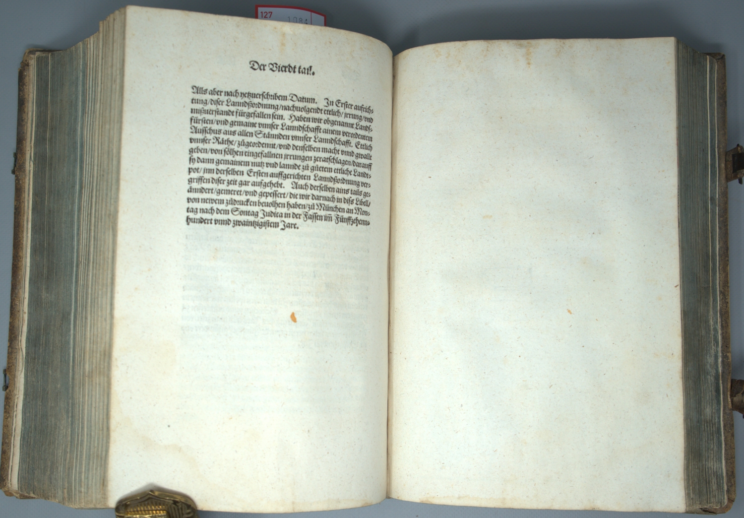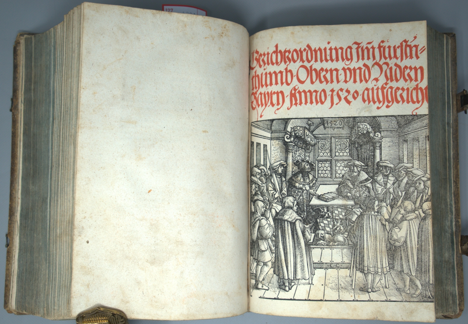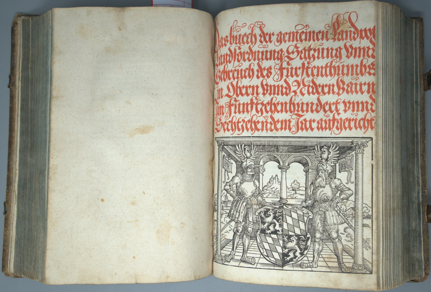 Vorhanden sind: I. Reformacion der bayrisch(e)n Lanndrecht nach Cristi unsers Hailmachers geburde Im Fünftzehenhundert unnd Achtzehendm Jar Aufgericht. 36 nn. Bl. CLXVIIII Bl. (1535). - VD16 B 1008. - II. Das Buech der gemeinen Landpot Landförderung Satzung umd Gebreuch des Fürstenthumbs in Obern umd Nidern Bairn im fünftzehenhundert umd sechtzehendem Jar aufgericht. 12 nn. Bl., LXVII Bl., 1 nn. Bl. (1520). VD16 B969. - III. Gerichtsordnung im furstnthumb Obern und Nidern Bayrn Anno 1520 aufgericht. 16 nn. Bl., LXXXVII Bl. 1520. VD16 B991. - IV. Die new Erklärung der Landsfreyhait des loblichen Haus und Fürstenthumbs Obern unnd Nidern Bairn. Anno fünfftzehenhundert unnd im Sechtzehenen auf den vierungzwainzigistn tag des Monats Aprilis zu Ingelstat aufgericht. 18 Bl. (1545). - VD16 B 982. - V. Die Ordnung uber gemainer Lanndtschafft in Bayrn auffgerichte Hanndtuesst. Tausentfünfhundert und im sechsehenden jar zu Ingolstat beschlossen. 7 Bl. (1545). - VD16 B 1006. – Vorderes Innengelenk verstärkt. Titel mit hinterlegter Fehlstelle, teilweise etwas fingerfleckig und durchgehend mal stärker mal schwächer feuchtrandig. Sonst gutes Exemplar.