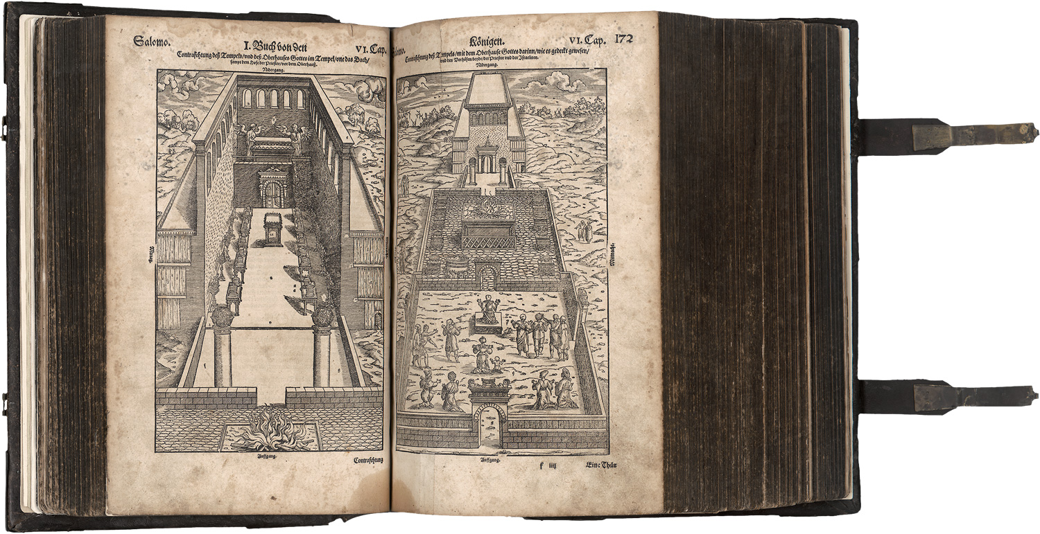 Biblia germanica. - Biblia. Das ist: Die gantze heylige Schrifft, Teutsch. D. Mart. Luther. 4 Teile in 1 Band. 20 Bl., 316 num. Bl.; 216 num. Bl.; 370 num. Bl., 2 Bl; 82 Bl. Mit 2 großen Holzschnitt-Titelbordüren, großer Holzschnittvignette und 141 teils später, unfachmännisch ankolorierten Textholzschnitten von J. Bocksperger und J. Amman ohne das Holzschnitt-Porträt. Titel in Rot und Schwarz. 35 x 23,5 cm. Leder d. Z. (berieben, mit kleinen Fehlstellen und Kapitale mit teils hinterlegten Einrissen) über Holzdeckel und 7 Bünden mit 8 Messingbeschlägen und zwei Messingschließen. Frankfurt, (Georg d. Ä. Rab, Erben W. Han und S. Feyerabend), 1569.