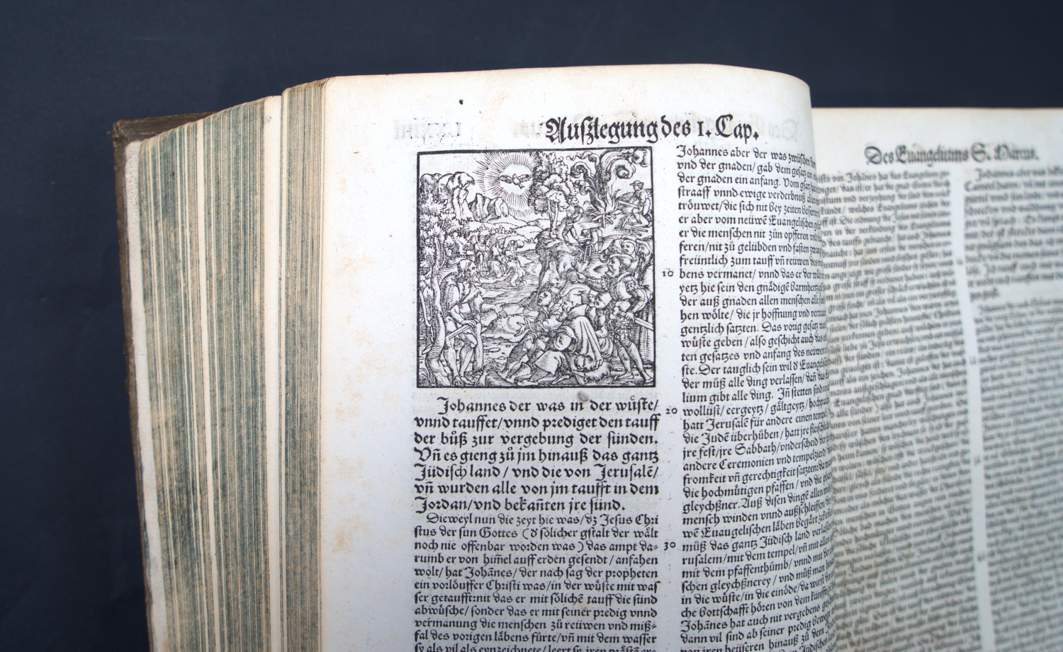 Erasmus von Rotterdam, Desiderius. Paraphrasis oder Postilla Teütsch. Das ist klare Außlegung aller Evanglischen unn Apostolischen Schrifften des Neuwen Testaments. 32 Bl., CCCCCXCIII num. Bl. Mit Holzschnitt-Druckermarke auf dem Titel und zahlreichen Text-Holzschnitten. 30,5 x 19,5 cm. Schweinsleder d. Z. (berieben, bestoßen und fleckig) über abgefasste Holzdeckel, fünf Bünden und mit zwei Messingschließen. (Zürich, Froschauer, 1552).