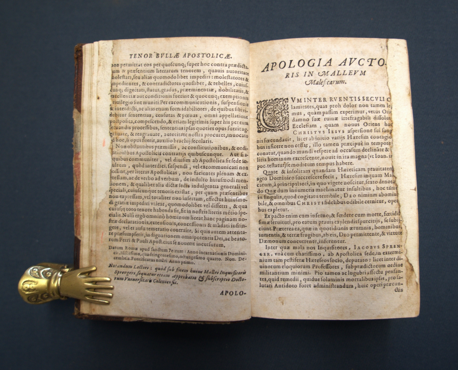 Die Autorschaft seines Mitbruders Jakob Sprenger, die auch im vorliegenden Exemplar, das von dem Servitenmönch Raffael Maffei herausgegeben und überarbeitet wurde, erhalten blieb, ist nach heutigem Forschungsstand hingegen umstritten und wird als Verleumdung beschrieben, da Sprenger sich als Gegner der Hexenverfolgung bekannte (Vgl. Tschacher, Lexikon zur Geschichte der Hexenverfolgung). – Nur der erste Band vorhanden. Knapp beschnitten, Titel mit Fehlstelle (Text etwas betroffen), ersten sechzehn Blätter mit größerer bis kleinerer hinterlegten Fehlstelle am Außensteg, die letzten fünfundzwanzig Seiten mit Feuchtrand sowie durchgehend etwas stockfleckig.