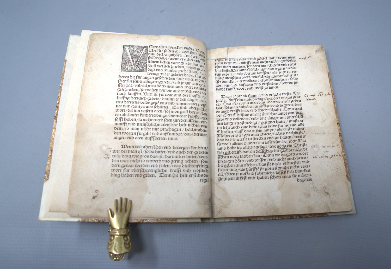 VD16 L 6690. Benzing 2753. Kuczynski 1720. Knaake 607 – Erste Ausgabe. Luthers Wochenpredigten über Kapitel XVII des Johannesevangeliums fanden 1528 und 1529 jeweils an Samstagabenden statt. Caspar Cruciger (1504-1548), der wahrscheinlich selbst Hörer war, edierte sie schliesslich auf Bitten Luthers und auf Grundlage der Aufzeichnungen Georg Rörers (1492-1558). Da die vorliegende Predigt vom Text Rörers erheblich abweicht, dürfte Cruciger noch auf andere Quellen, vermutlich auch auf seine eigene Mitschrift, zurückgegriffen haben. – Durchgehend mal mehr, mal weniger, teils auch stärker gebräunt, fleckig und feuchtrandig sowie mit einigen alten Annotationen.