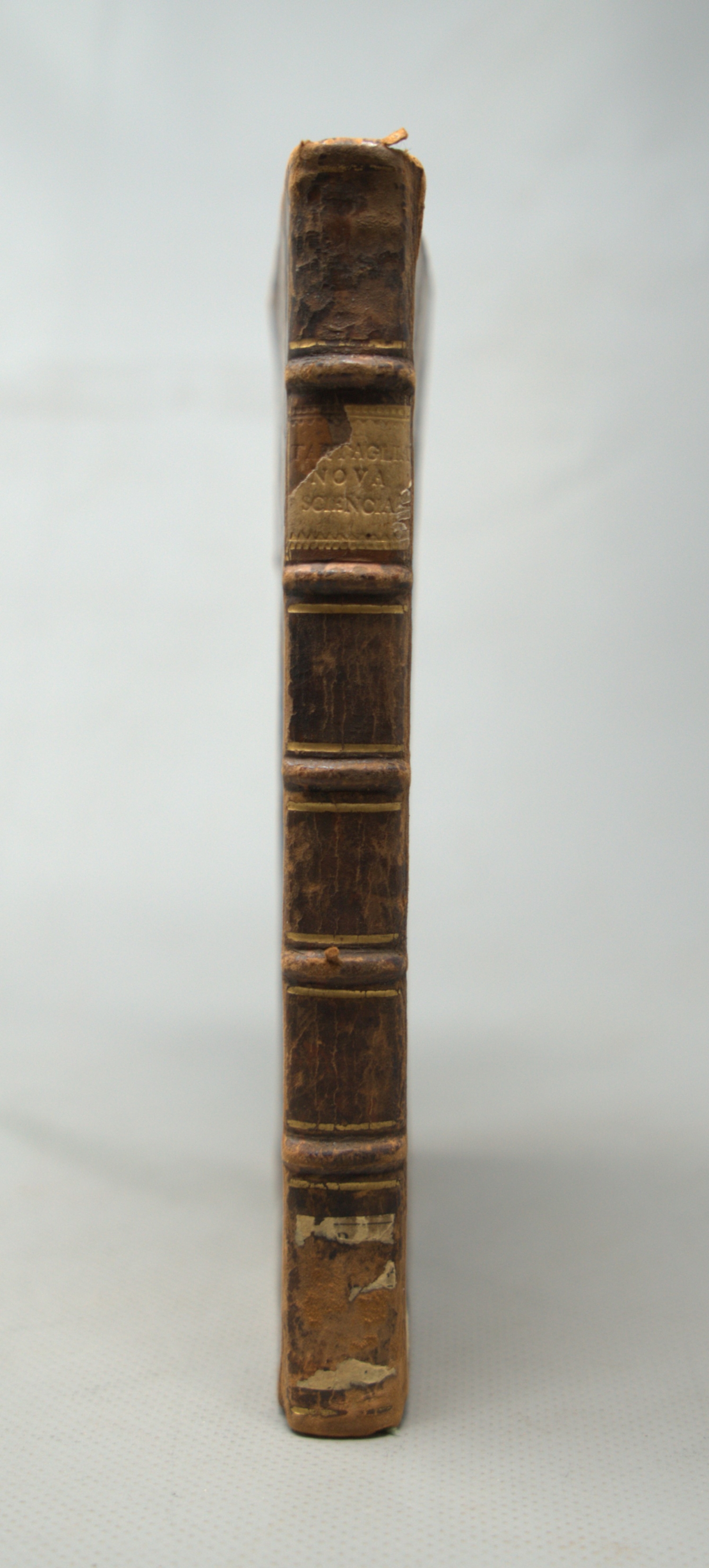 Tartaglia, Niccolò. La nova scientia con una gionta al terzo libro. 6 Bl., 34 fol. Bl., 95 S. Mit gefalteter Übersichtstafel in Holzschnitt. 20 x 14 cm. Leder d. 19. Jahrhunderts (stark berieben, Kapitale bestoßen, am unteren Rücken Reste eines Signaturschilds) mit goldgeprägtem RSchild. (Venedig, 1546).