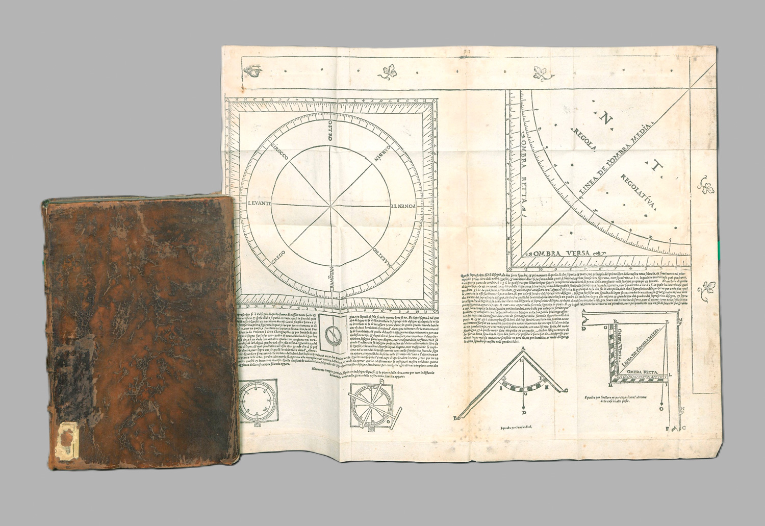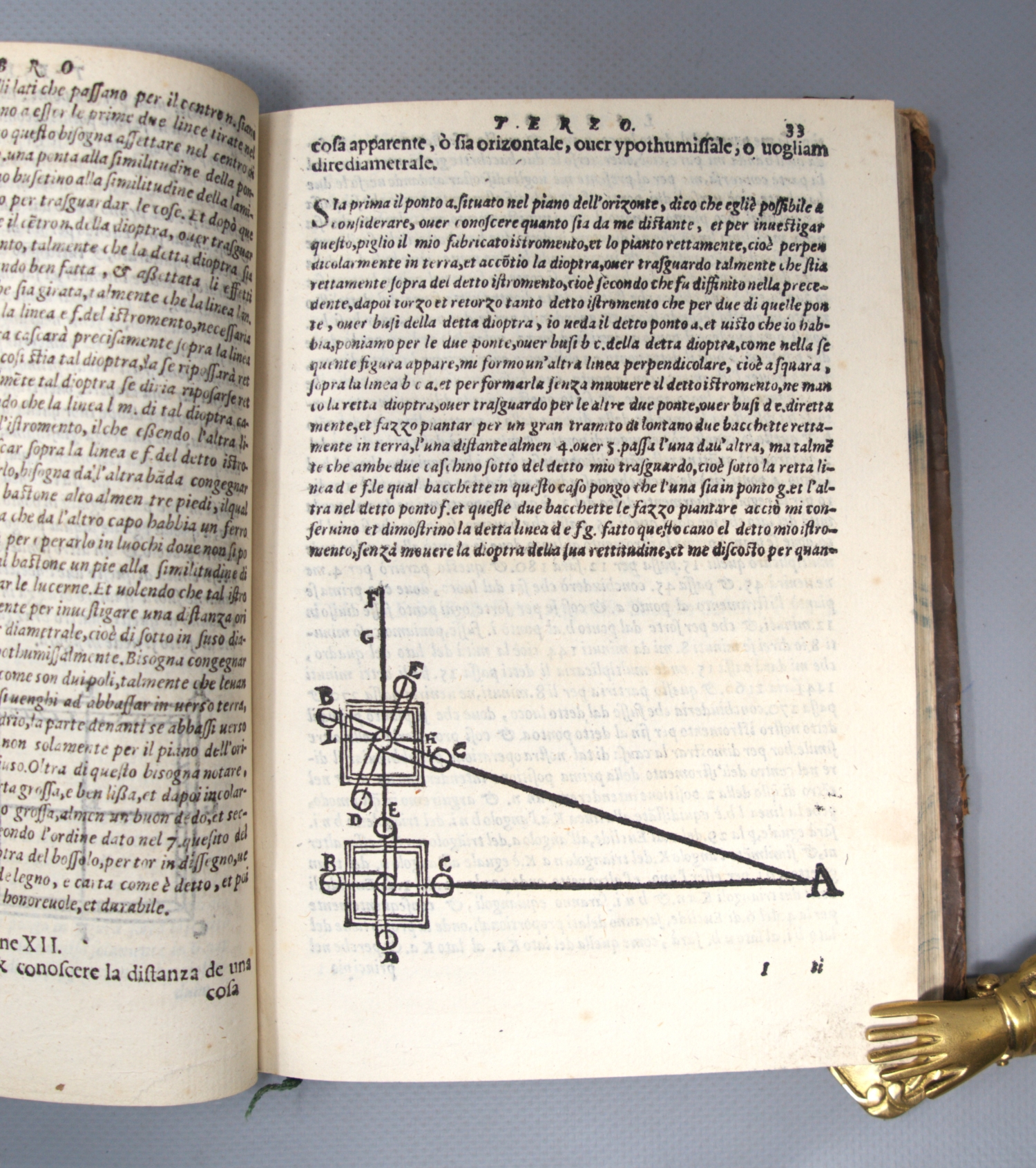 Das Titelblatt zeigt einen großformatigen Holzschnitt mit dem Wappen Francesco Maria II. della Roveres, Herzog von Urbino. Darunter eine beinahe ganzseitige allegorische Darstellung, in der Tartaglia im Zentrum verschiedener - weiblich personifizierter - Wissenschaftsdisziplinen erscheint, umgeben von Autoritäten der Antike wie Euklid, Aristoteles und Platon. – Innenspiegel mit zwei montierten Bibliotheksschildern (eines fast entfernt). Stockfleckig und papierbedingt gebräunt.