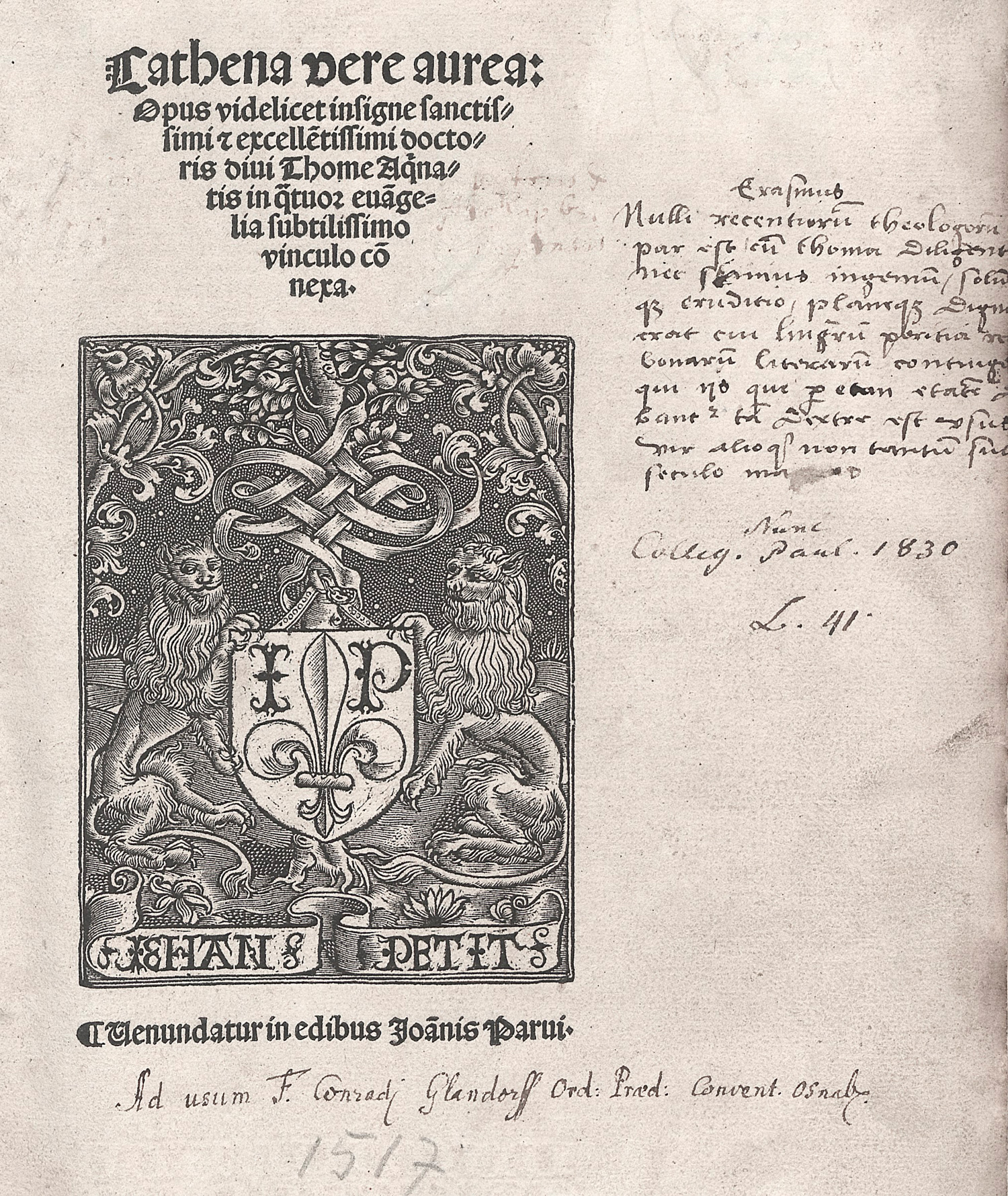 Adams A 1472. Moreau 1714. – Bereits in der Inkunabelzeit öfter aufgelegt. Schöner zweispaltiger Druck von Jean Petit. Die "Catena aurea" wurde 1262/1263 von Papst Urban IV. bei Thomas von Aquin in Auftrag gegeben. Es handelt sich um eine Sammlung exegetischer Zitate der Kirchenväter in Form einer fortlaufenden Kommentierung der Evangelientexte. Schon Thomas' Zeitgenossen erkannten den Wert dieses Werkes, das später den Titel "Goldene Kette" erhielt. – Es fehlt Blatt XI mit der Foliierung bIII. Innengelenke etwas geöffnet, Titel papierbedingt gebräunt, insgesamt braun- und fingerfleckig, teilweise etwas feuchtrandig, und vereinzelt mit hs. Notizen. Titel mit hs., 14-zeiligen Besitzvermerk von "Colleg. Paul 1830" und hs. 1-zeiligem Besitzvermerk von "F. Conrad Glandorff".