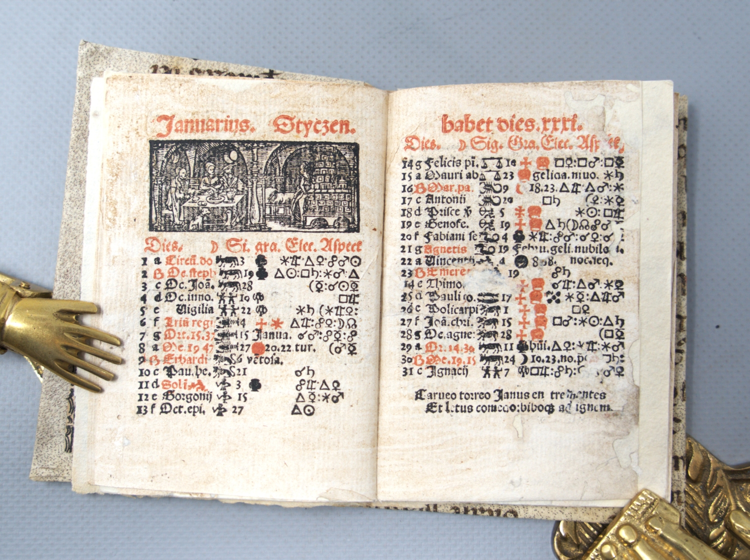 Vislicza, Michael de (Michal z Wiślicy). Ephemeridiarium Anni Christi 1536. per Magistrum Michaelem a Visticza. In celebri studio Cracoviense diligentia ordinatum. 16 nn. Bl. Mit großer Holzschnitt-Titelvignette und 12 Textholzschnitten. Ca. 11 x 7,5 cm. Moderner Pergamentband unter Verwendung eines Handschriftenfragment des 13. Jahrhunderts. (Krakau, Matthias Scharffenberg, 1536 [i. e. 1535]).