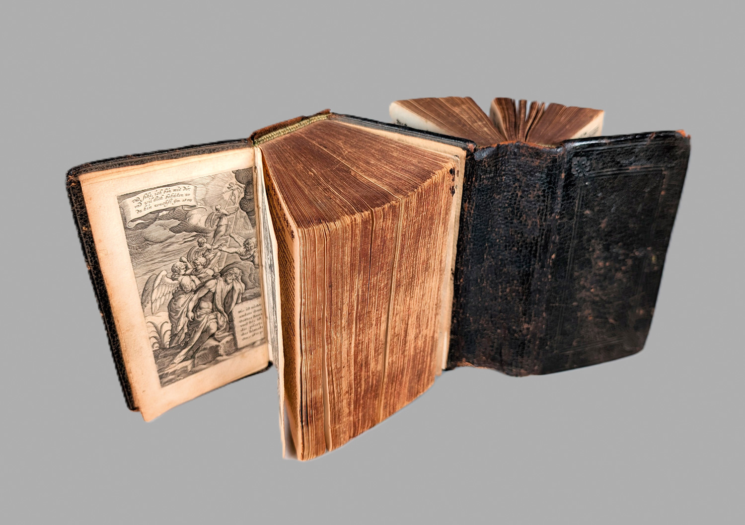 Biblia germanica. - Biblia das ist die gantze Heilige Schrift Deutsch: D. Mart. Luthers. 48 Bl., 408 S.; 1 Bl., 542 S.; 1 Bl. 590 S.; 1 Bl., 426 S., 4 Bl. Mit gestochenem Frontispiz, Kupfertitel, 3 Holzschnitt-Bordüren und 1 Holzschnitt-Druckermarke. 14 x 7 cm. Leder d. Z. (bestoßen, wenige Wurmlöcher, Leder etwas brüchig) als Dos-à-Dos-Einband mit Blindprägungen und Datierung "1628" auf den Deckeln. Lüneburg, Stern, 1627.