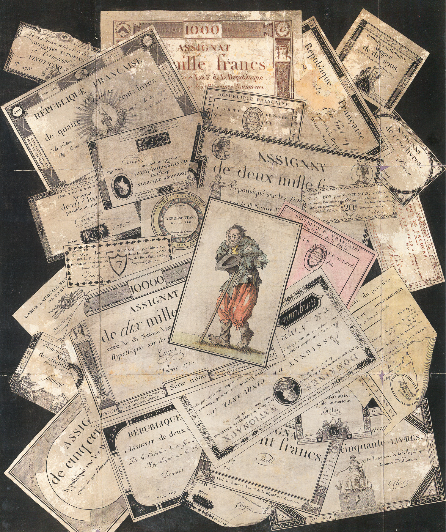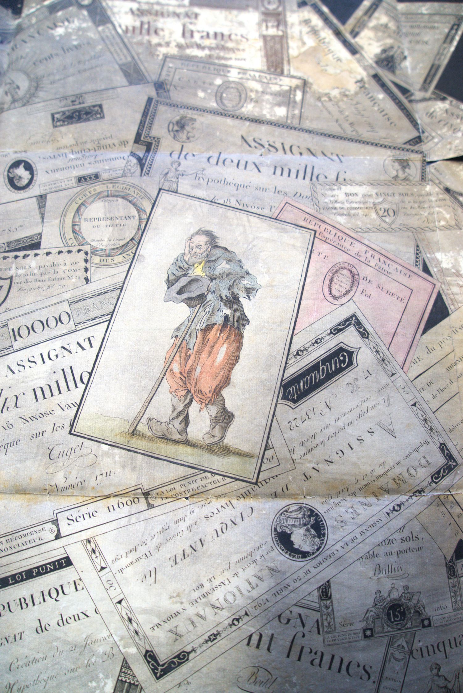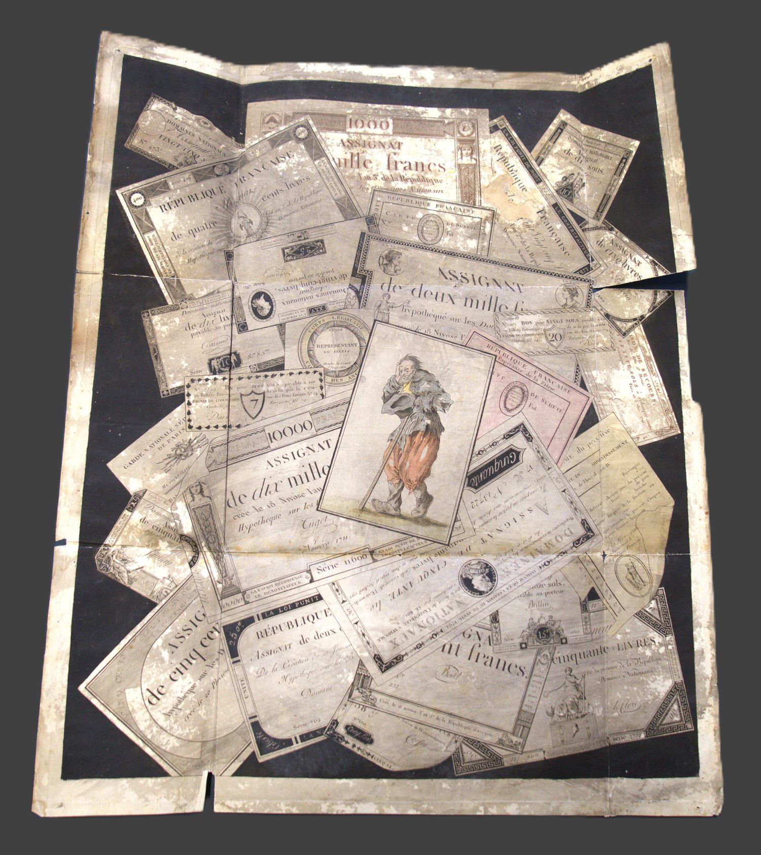 Der französische Stecher Joseph Hunin (1770-1851) fertigte mehrere Radierungen an mit Assignat-Scheinen als Motiv. Das Werk kritisiert die französische Politik während der Französischen Revolution. In dieser Zeit wurden Assignat-Scheine wie Geld gehandelt und wurden zum teils einzigen Zahlungsmittel. Diese verfielen jedoch rasch der Inflation und führten zu einer starken Verarmung von Arbeitern, die vorwiegend mit Assignat-Scheinen bezahlt wurden. – Stärker berieben, mit mehreren Falzen, mit größeren Einrissen und teils hinterlegten Fehlstellen sowie mit Montagelöchleins. Seltener Druck.