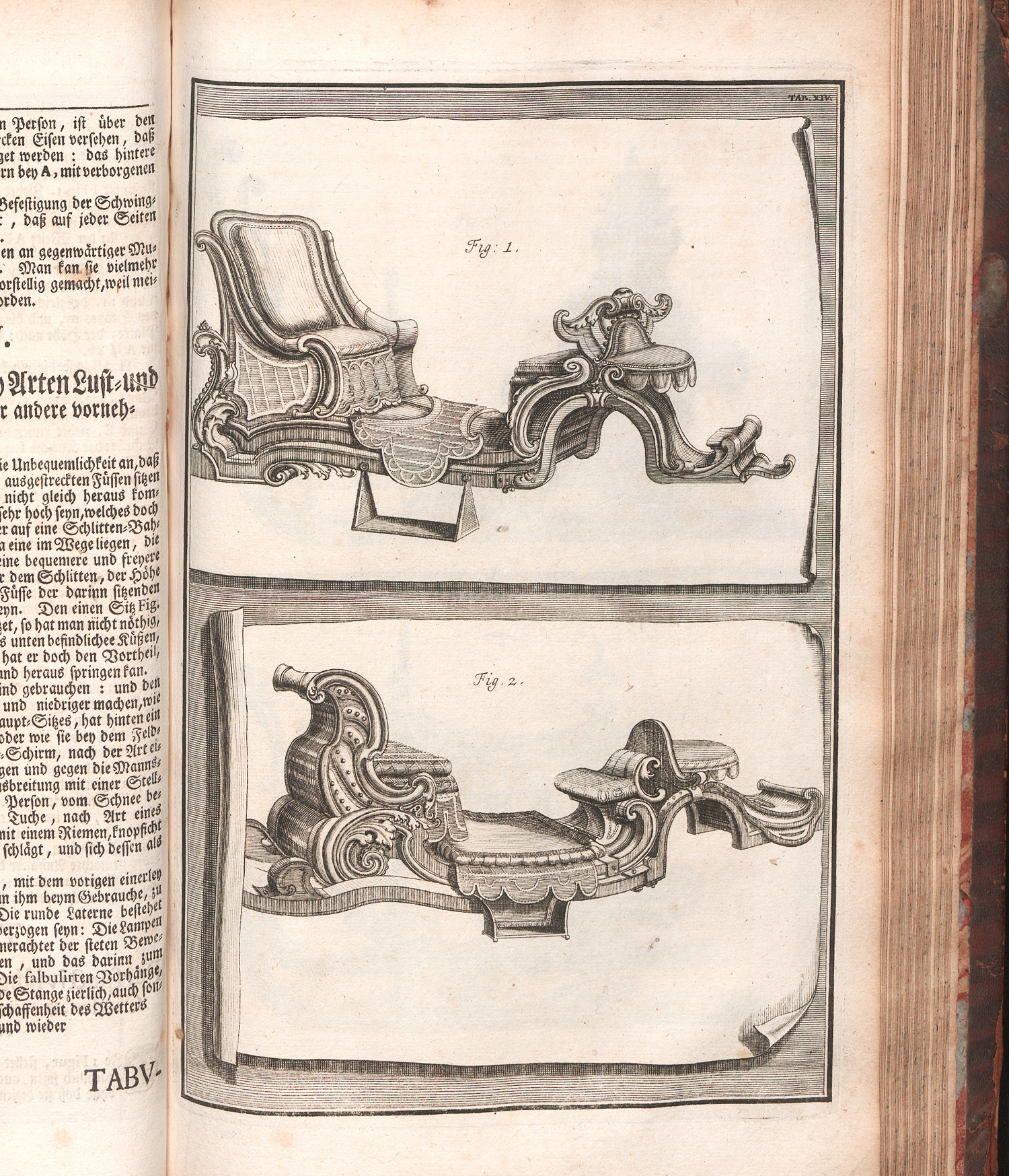 Vorhanden sind: I. Nützliche Anweisung zur unentbehrlichen Zimmermanns-kunst. 152 S., 4 Bl. Mit 44 Kupfertafeln. 1731. - Ornamtentstich-Sammlung 2182. UCBA II, 1854. Millard Coll. 119. - Erste Ausgabe. - II. Zweyter Theil des gründlichen Unterrichtes der vollständigen Säulen-Ordnung, nach der heutigen Baukunst. 2. (von 2) Teil. 24; 1 Bl. Mit 18 Kupfertafeln. O. J. (wohl 1728). - Nicht in der Ornamentstich-Sammlung. - III. Nützliche Vorstellung und deutlicher Unterricht, von zierlichen, bequemen und Holz ersparenden Stuben. 42 S. Mit gestochenem Frontispiz und 24 Kupfertafeln. 1728. - Nicht in der Ornamentstich-Sammlung. - IV. Cartouches oder Invertirte Schilde und Einfassungen. No. 162. Mit 12 Kupfertafeln. O. O., Dr., und J. (um 1730). - Nicht in der Ornamentstich-Sammlung. – Papierbedingt leicht gebräunt, Vorsatz und erstes Blatt leicht gelöst, teils etwas stock- und fingerfleckig sowie mit wenigen kleinern bis größeren Einrissen. Der erste Titel ist mit einem Besitzstempel versehen "Grossherzogl. Gewerbeschule zu Eisenach".