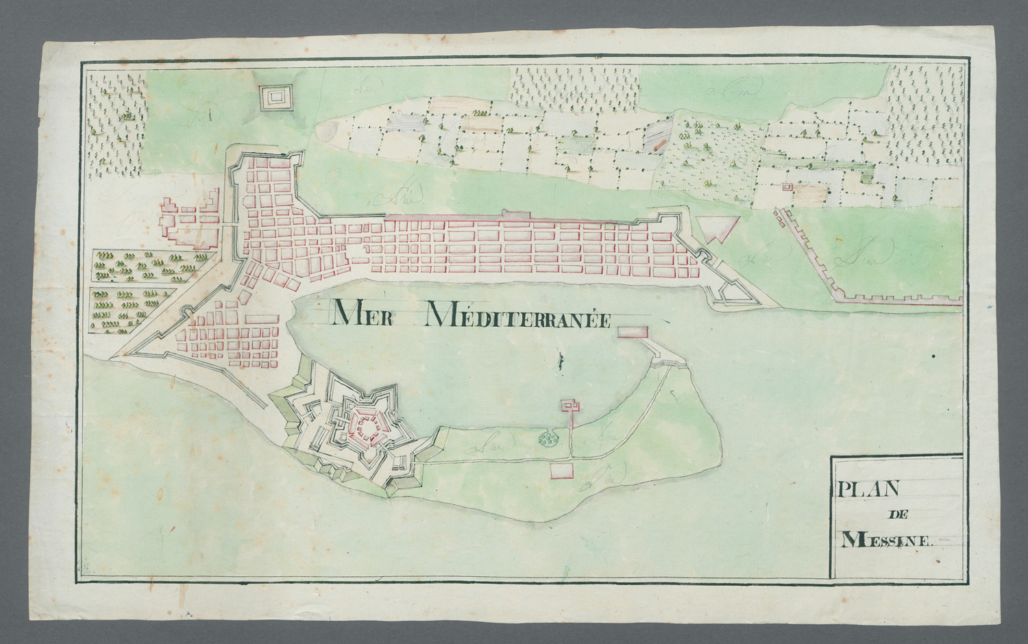 Mit feinem Duktus und in kräftigen Farben gezeichneter Plan der Stadt Messina.