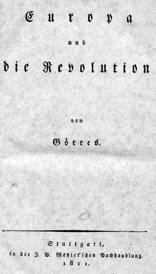 Görres, Joseph von. Europa und die Revolution. 1 Bl., 356 S., 1 Bl. 19,4 x 11,3 cm. Modernes Halbleder mit rotem RSchild. Stuttgart, J. B. Metzler, 1821.
