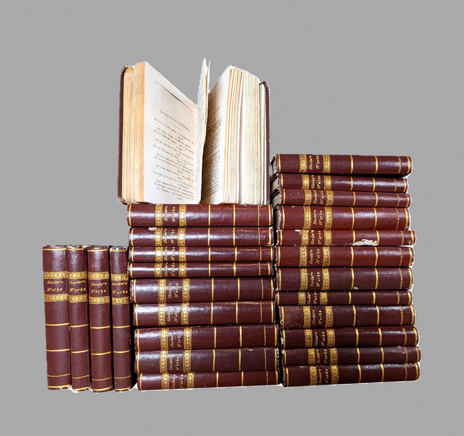 Goedeke IV/1, 737, 122. Schulte-Strathaus 67, 8. Günther-Volgina 7. – Zweite Gesamtausgabe, die im Unterschied zur ersten von 1805ff. im handlicheren Taschenformat erschien. Vorhanden sind: "Zur Religion und Theologie" (12 Bände), "Zur Philosophie und Geschichte", (11 Bände statt 12; ohne Teil IX), "Zur schönen Literatur und Kunst" (12 Bände) sowie der Supplementband mit der Biographie Herders von Heinrich Döring. – Etwas fleckig.