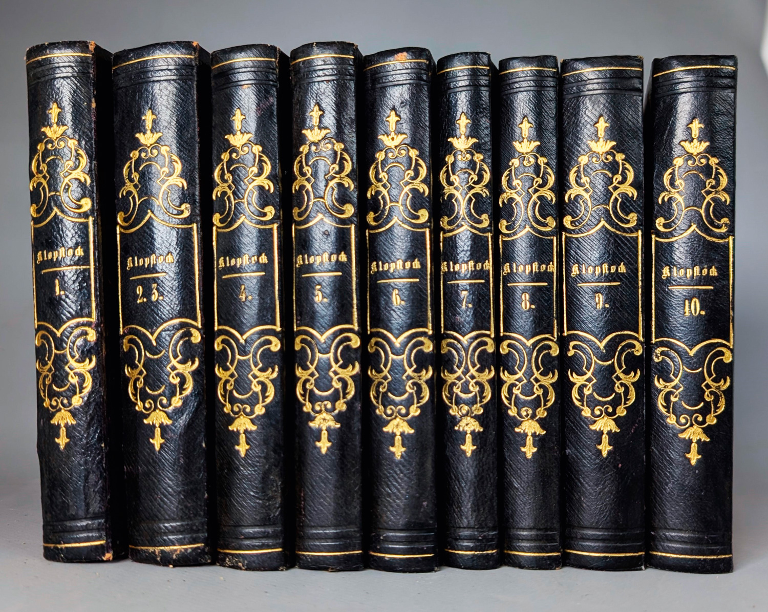 Klopstock, Friedrich Gottlieb. Sämmtliche Werke. 10 Teile in 9 Bänden. 14,5 x 11 cm. Schwarze Halbchagrinlederbände d. Z. (gering berieben) mit Romantiker-RVergoldung. Leipzig, G. F. Göschen 1854-1855.