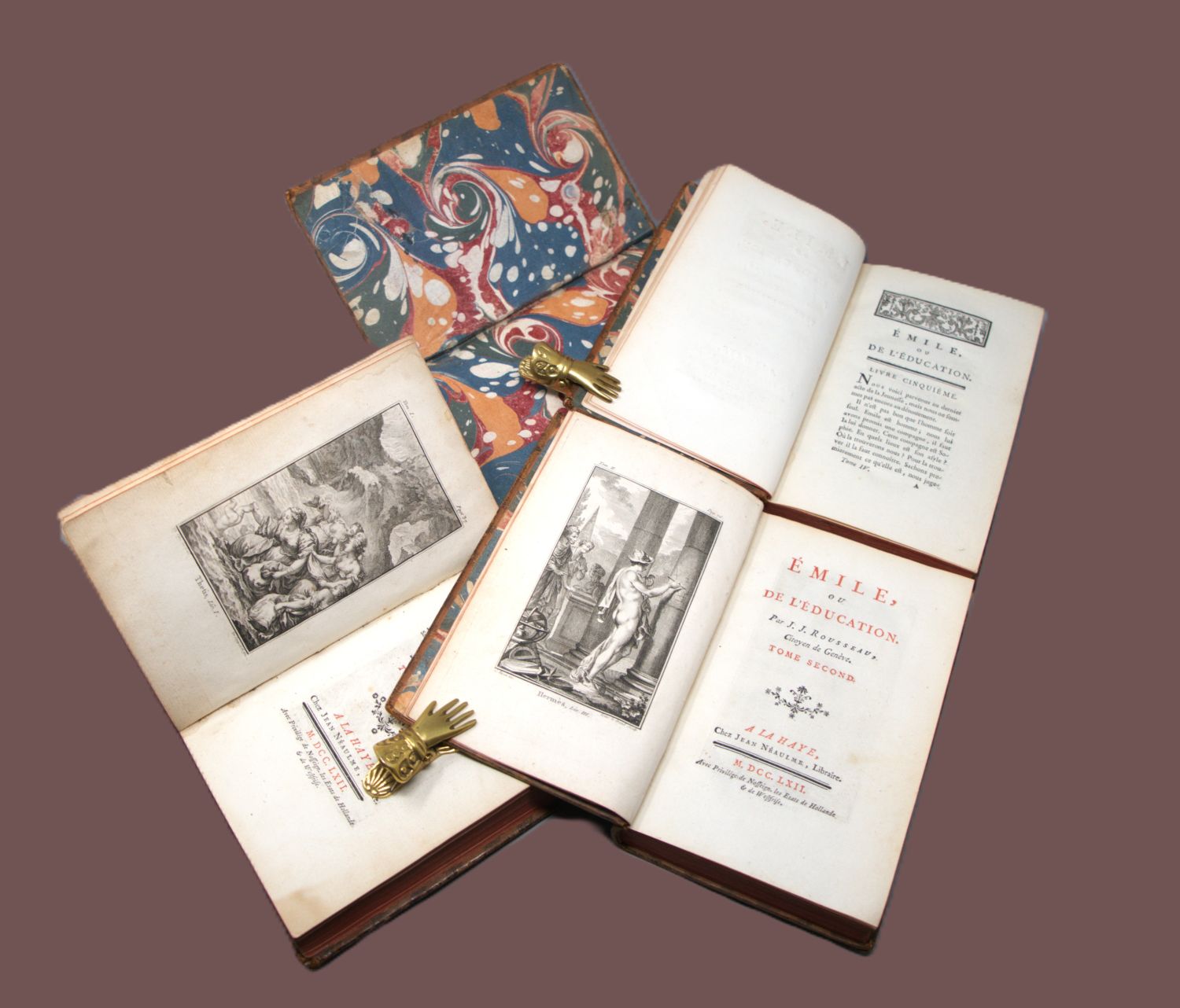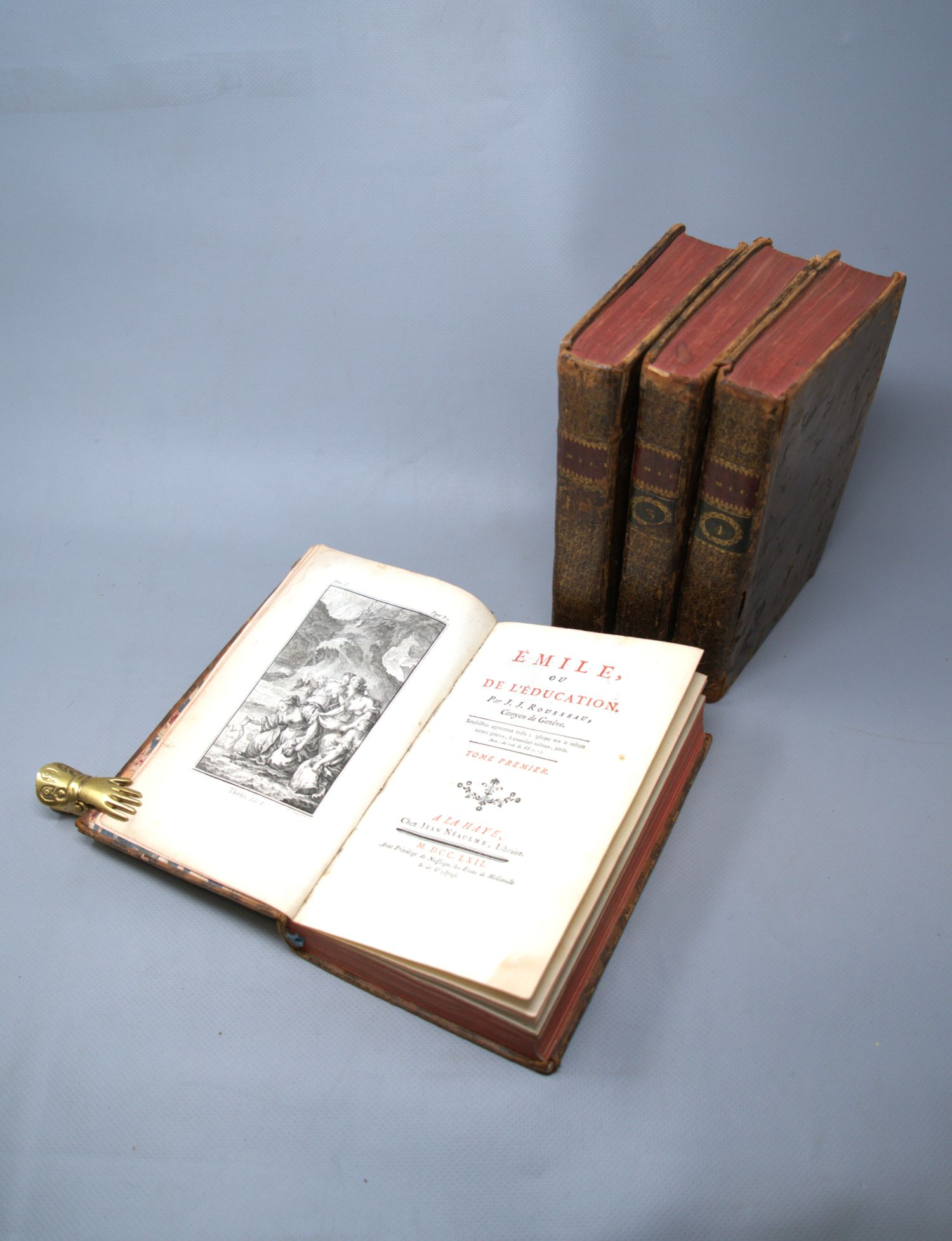 Rousseau, Jean-Jacques. Émile, ou de l'éducation. 4 Bände. Titel in Rot und Schwarz. Mit 5 Kupfertafeln nach Eisen. 19 x 12,5 cm. Marmorierte Kalbslederbände d. Z. (etwas beschabt und berieben) mit ornamentaler RVergoldung, je 2 goldgeprägten RSchildern (Band II fehlt eines) und dreifachen Deckelfileten. "A La Haye, Chez Jean Néaulme" (d. i. Paris, Duchsene), 1762.