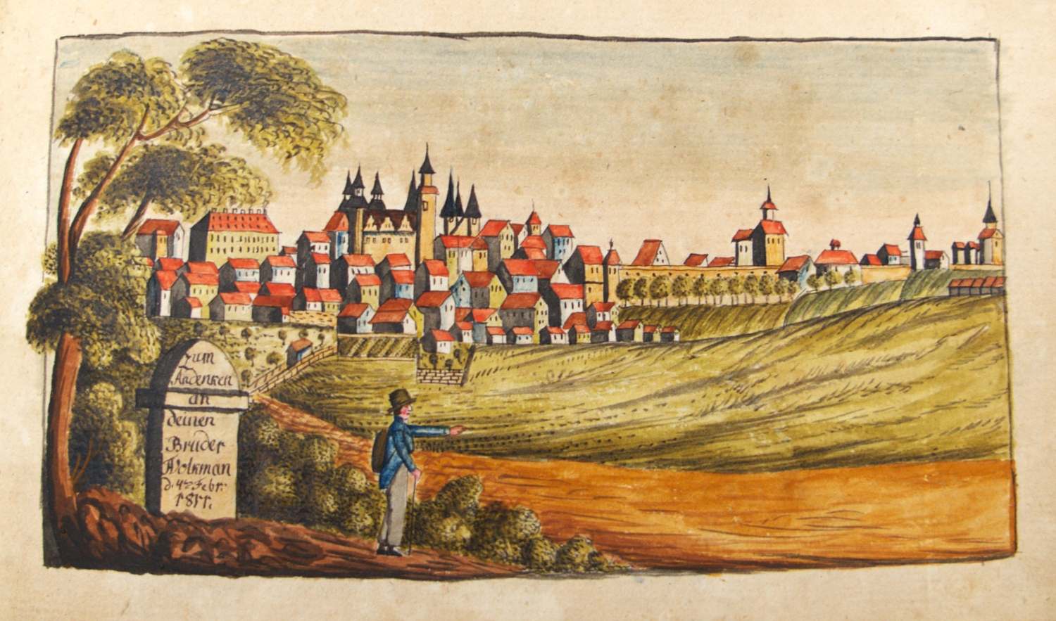 Fast alle Eintragungen von Freundinnen und Freunden in Merseburg. Eines der Aquarelle zeigt eine hübsche farbige Gesamtansicht von Merseburg, gefertigt vom "Bruder Friedrich Volckmann" der Stammbuch-Inhaberin. Ein anderes Blatt enthält eine Landschaft mit einer Vase im Mittelpunkt, darüber eine aus den Wolken kommende Hand, die eine Waage mit den Schalen "Liebe" und "Schmerz" hält. Die anderen reizvollen Malereien, teils mit Deckfarben, zeigen Blumengebinde. - Lose beiliegend 1 Blatt mit Aquarell von 1820, ferner 2 vielleicht nicht hierzu gehörige Blätter mit einer Blumenstickerei bzw. einem kolor. Kupferstich. - Stellenweise leicht gebräunt, sonst gut erhalten.