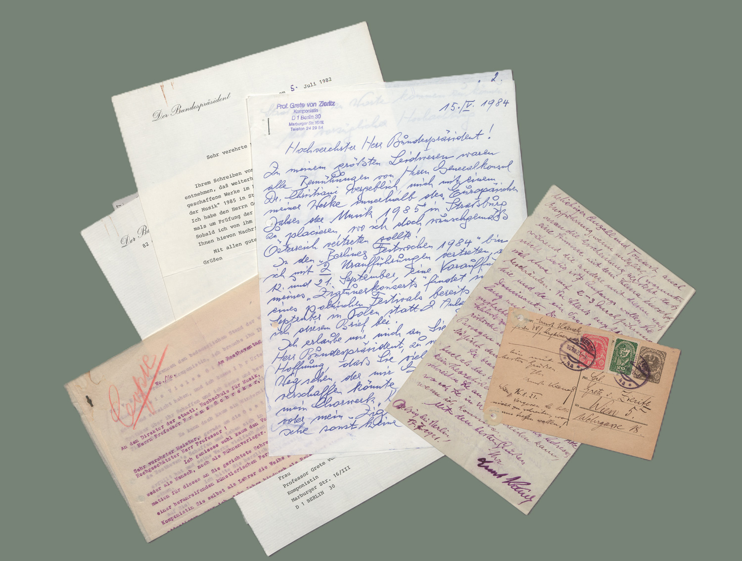 An seine Schülerin, die angehende Komponistin Grete von Zieritz (1899-2001). Der Brief enthält eine ausführliche, sehr interessante Anleitung zur Komposition einer Fuge. "... Da ich ebenfalls erst am 12.-15. August in Wien eintreffe, so werden wir dort wenig Zeit zum Arbeiten haben. Ich möchte Ihnen daher empfehlen, bis dahin 4-5 Fugen zu schreiben, dann aber doch, wenn möglich, nach Wien zu kommen und sie mir zu zeigen. Ich würde Ihnen dann an Hand dieser Fugen sagen, woran es etwa fehlt und wir könnten in der uns zur Verfügung stehenden Zeit eine Musterfuge herstellen, mit der Sie dann weiterfahren können. Zur Komposition von Fugen wollen Sie bitte folgendes beachten: man braucht ein melodisch und rhythmisch prägnantes Thema (prägnant nicht mit gesucht zu verwechseln!), für den Anfang ohne starke Chromatik (mit einer latenten, aber deutlich erkennbaren Tonalität), aber doch mit einem chromatischen Keim, da es sonst schwer fällt, im Verlauf des Stückes die nötige Abwechslung in der Harmonie einzuführen. Die Themen sollen auch nicht zu lang sein. Sie können real oder tonal beantwortet werden, d. h. mit genauer Beibehaltung aller Tonschritte oder mit Abänderung der Tonika-Dominantschritte (Quintschritte) in Dominante-Tonikaschritte (Quart). Jene Beantwortung tritt ein, wenn das Thema zur selben Stufe zurückkehrt, von der es ausgeht ... Die Beantwortungen erfolgen in den einzelnen Stimmen schachbrettförmig: die 1. Stimme bringt das Thema, die 2. beantwortet es in der Dominante, die 3. bringt es in der Tonika u.s.w. ... Nach der 1. Durchführung folgt ein Zwischenspiel, das eventuell sequenzierend sein kann, die Stimme, die mit dem Thema wieder einsetzen soll, pausiert inzwischen. Es folgen Durchführungen und Zwischenspiele in beliebiger Anzahl und Tonart, auch Ausführung, wenn möglich ... Anfangs wollen Sie sich etwa auf 2-3 Durchführungen beschränken. Vom Schluß empfiehlt sich hie und da ein Orgelpunkt auf der Dominante. Die ganze Fuge nicht zu lang und musikalisch einem Höhepunkt zustrebend ... Klavieristische Bildungen (Akkordbrechungen, Passagen u. dgl.) sind auszuschließen! Möglichst durchsichtiger Klaviersatz! - Sie brauchen kein anderes Lehrbuch als das Wohltemperierte Klavier - kein Theoretiker reicht heran! ..." (Belzig 17.VII.). - Die Postkarte behandelt das geplante Treffen in Wien. "... Sie könnten mir dann gleich zeigen, was Sie gearbeitet haben, und wenn wir fleißig sind, können wir in einer Woche sehr weit kommen, falls Sie solang hier bleiben ...". - Beide Teile gelocht, die Karte zusätzlich mit Lochverstärker versehen. - 5 Beilagen: 1.) Eine nicht signierte Durchschrift des masch. Briefes (11/2 S., gr. 4to. Berlin 26.III. nach 1920) eines Berliner Musikverlegers an Franz Schreker, den Direktor der Berliner Staatl. Hochschule für Musik, mit einer warmen Empfehlung der Komponistin Grete von Zieritz für ein Stipendium, wobei er sich auf seine Freundschaft mit Josef Joachim, Richard Strauss und Hans Pfitzner beruft ("Diese Künstler von Rang können über meine Person, als uneigennütziger Kunstförderer [Maecen kann ich nach 1914 nicht mehr sein] Auskunft erteilen"). - 2.) Die Durchschrift eines handschriftlichen Briefes von Grete von Zieritz (11/3 S. Gr. 4to. Berlin 15.V.1984) an den österreichischen Bundespräsidenten Rudolf Kirchschläger. - 3.) und 4.) Rudolf Kirchschläger, Bundespräsident Österreichs 1974-1986. 2 Briefe m. U. "Kirchschläger". Zus. 1 S. Gr. 4to. Wien 5.VII.1982 und 23.N.1984. - Jeweils an Grete von Zieritz, über geplante Aufführungen ihrer Werke bei Festwochen in Straßburg und Berlin. - 5.) Ein Berliner Zeitungsartikel über Grete von Zieritz im Dezember 1999.