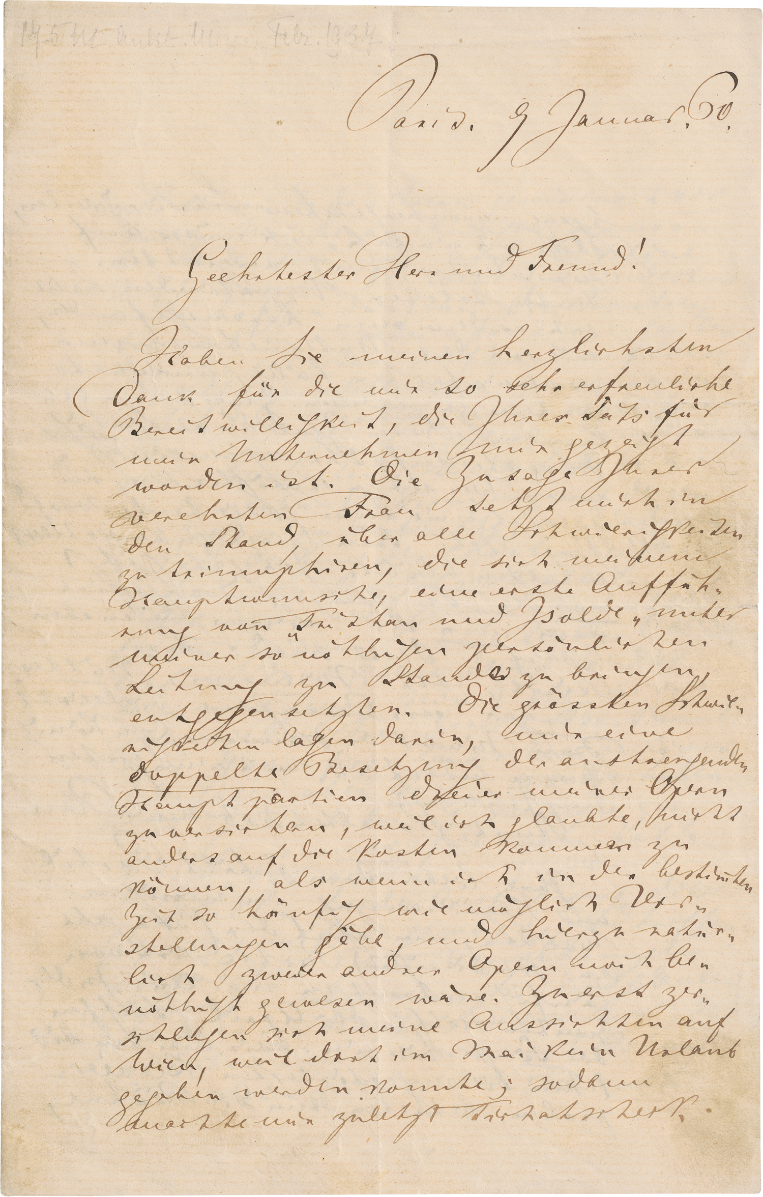 An den (nicht genannten) Schauspieler Emil Bürde, Ehemann der Dresdener Primadonna Jenny Bürde-Ney. Sehr umfangreicher und bedeutender Brief über Wagners Bemühungen in Paris, die Organisation, Besetzung und Finanzierung der Uraufführung von "Tristan und Isolde" zuwege zu bringen. Bedankt sich für die Unterstützung seines "Unternehmens" und die Zusage der Frau des Adressaten, die Partie der "Isolde" zu übernehmen. Wagner erklärt zunächst ausführlich die Schwierigkeiten bei der Besetzung. "... Die Zusage Ihrer verehrten Frau setzt mich in den Stand, über alle Schwierigkeiten zu triumphiren, die sich meinem Hauptwunsche, eine erste Aufführung von 'Tristan und Isolde' unter meiner so nöthigen persönlichen Leitung zu Stande zu bringen, entgegen setzten. Die größten Schwierigkeiten lagen darin, mir eine doppelte Besetzung der anstrengenden Hauptpartien dreier meiner Opern zu versichern, weil ich glaubte, nicht anders auf die Kosten kommen zu können, als wenn diese in der bestimmten Zeit so häufig wie möglich Vorstellungen gäbe, und hierzu natürlich zweier andrer Opern noch benöthigt gewesen wäre. Zuerst zerschlugen sich meine Aussichten auf Wien, weil dort im Mai kein Urlaub gegeben werden konnte; sodann machte mir zuletzt Tichatscheck so ganz unvorhergesehene Schwierigkeiten, dass ich einsah, ich müsse auf seine Mitwirkung verzichten ...". Er habe nun überlegt, wie er die Problematik vereinfachen könne. "... Dieser Zweck ist erreicht, die erste Aufführung meines neuen Werkes zu ermöglichen, und dies ist mir nun gesichert, sobald Ihre liebe Frau mir zuversichtlich erhalten bleibt. Ich gebe jetzt nur den 'Tristan', und engagire dazu nur die Sänger, deren eben bedarf. Diese sind Frau Bürde, Hr. Niemann, Mitterwurzer, zur Brangäne vielleicht Frau Nimbs in Hannover; (zu König Marke bedarf ich noch einer guten Empfehlung).