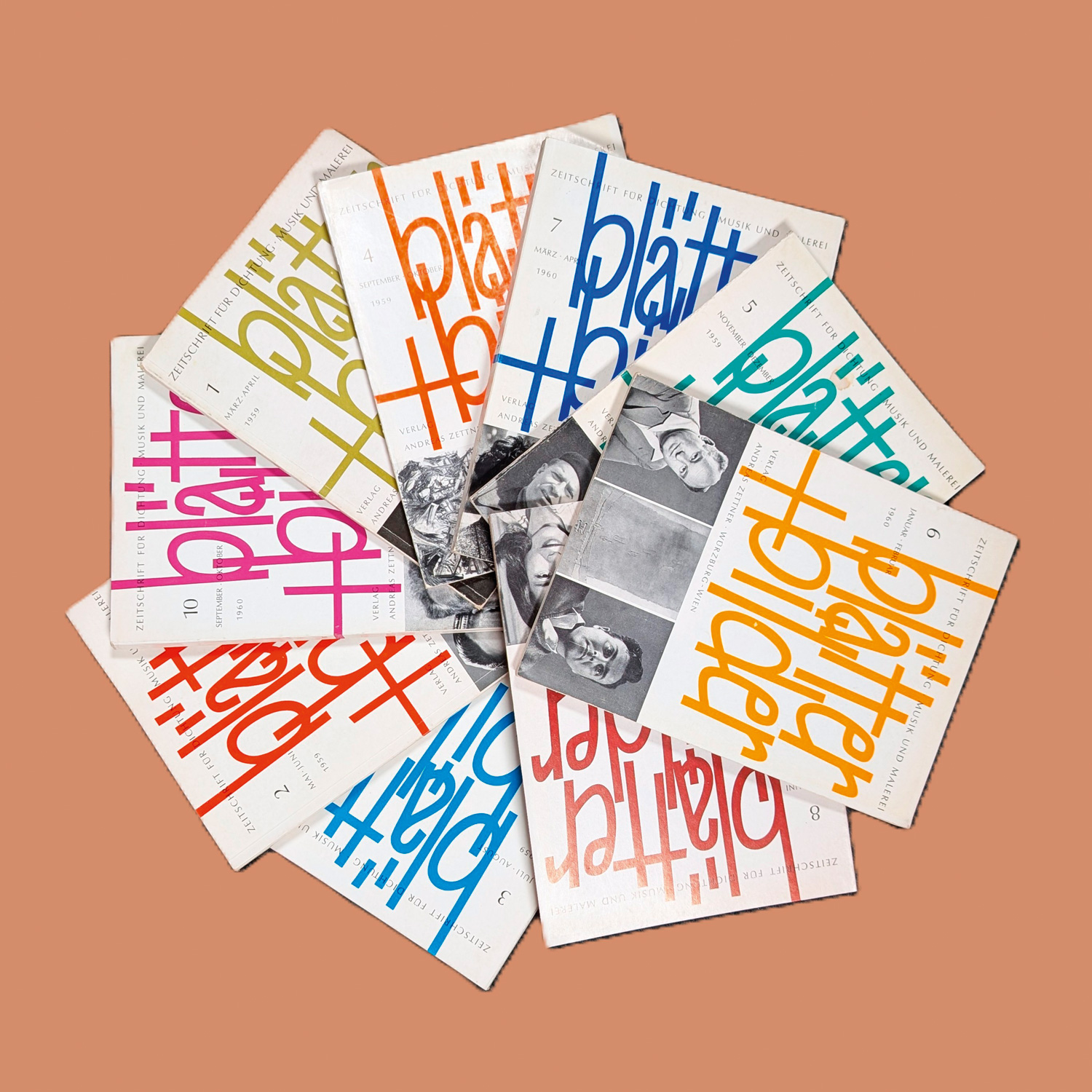 blätter + bilder. Eine Zeitschrift für Dichtung, Musik und Malerei. Herausgegeben von Horst Bienek und Hans Platschek. Heft 1-14 (alles Erschienene). Mit zahrleichen Abbildungen. 25 x 18,5 cm. Illustr. OHefte. Würzburg und Wien, A. Zettner, März/April 1959-Sept./Nov.1961.