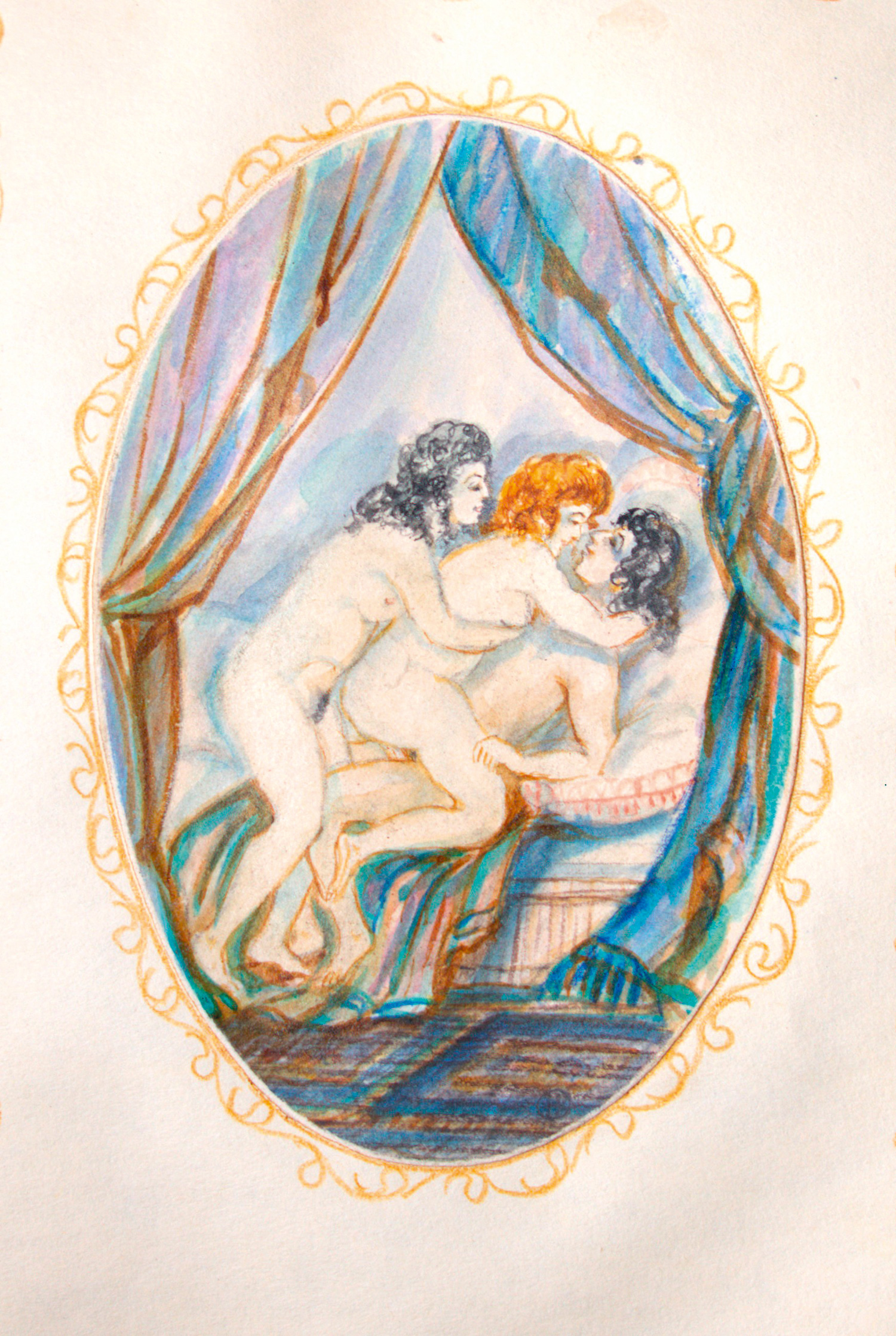Nummeriertes Exemplar (Nr. 1). Jeder Band enthält mehrere Originalaquarelle (oval, montiert, jeweils mit einfacher Farbstift-Bordüre), insgesamt 56, die oft drastische erotisch-pornografische Szenen zeigen, teils rechts unten mit winzigem Monogramm "HK" (ligiert in einem Kreis).