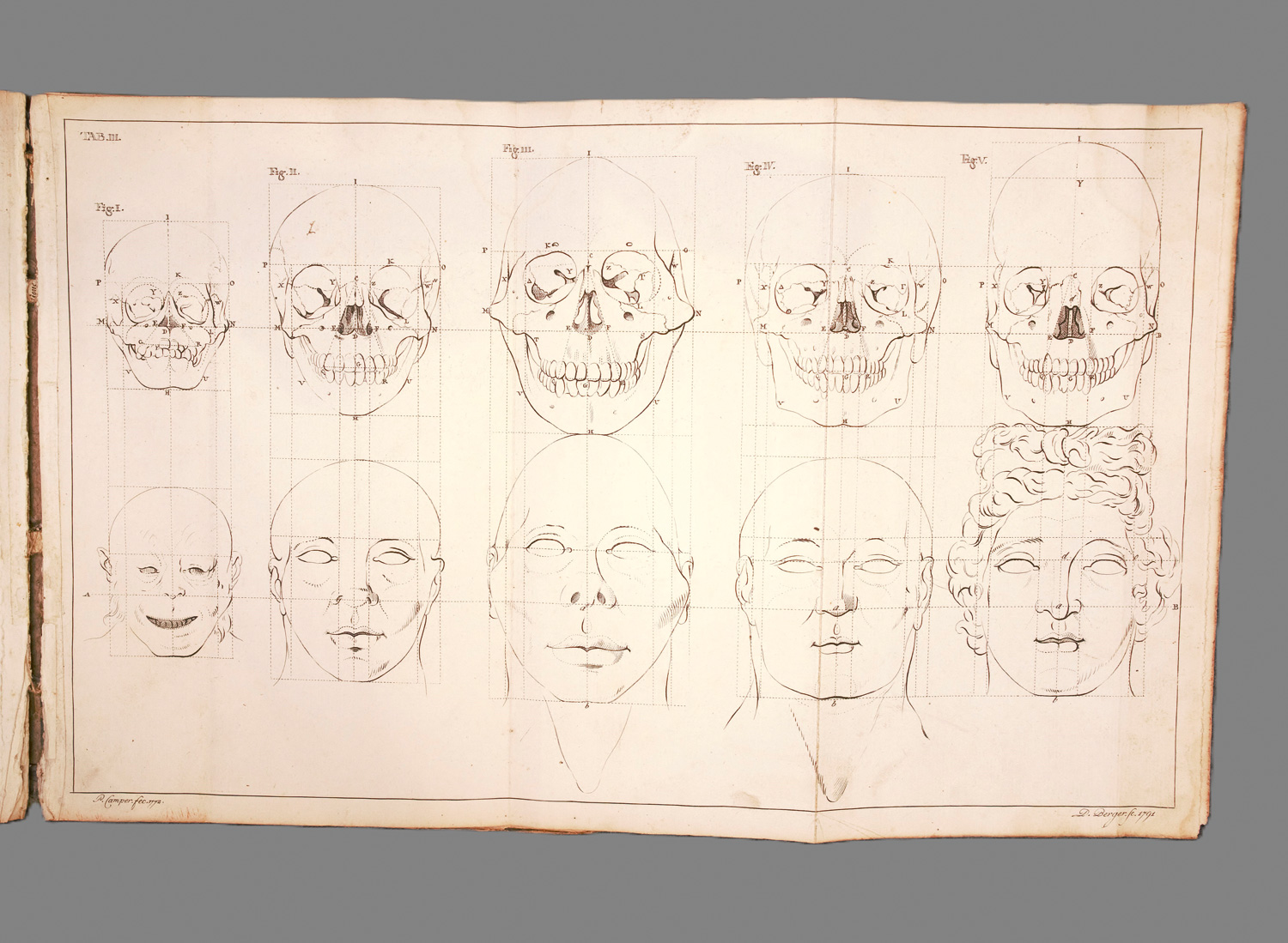 Blake 76. Garrison-Morton 158. Waller 173. Vgl. Hirsch-Hübotter I, 814. DSB III, 38. Cicognara 2430. – Erste deutsche Ausgabe. Hauptwerk über menschliche Schädelformen, Kopfvermessung und Physiognomie, darüber hinaus ein Beitrag zur künstlerischen Proportionslehre, vom bedeutendsten vergleichenden Anatomen des ausgehenden 18. Jahrhunderts. Erstmals 1791 posthum erschienen. - "Daß Camper, der so vortrefflich den Zeichenstift hantirte, sich auch weiter mit bildender Kunst beschäftigt hat, gab Anleitung zu seiner Entdeckung des 'Angulus facialis', der seinen Namen trägt und als ein erster Versuch menschlicher Schädelmessung aufgefaßt werden muß ... während die Maler noch in unserer Zeit seine Constructionsmethode des Kopfes als sehr brauchbar anerkennen, weil sie von dem richtigen Princip ausgeht" (Hirsch). Enthält die Beschreibung der kraniometrischen Methoden Campers. "His measurement of the 'facial angle' ... 'Camper's line' contributed to the foundation of anthropology" (DSB). – Mit neuen Vorsätzen, Innengelenke etwas gelockert. Hs. Besitzvermerk auf dem Titel, Text etwas wellig, Tafeln teils schwach wasserrandig und fleckig, weißer Außenrand der Tafeln VI und VII angeschmutzt und mit kleinen Randeinrissen.