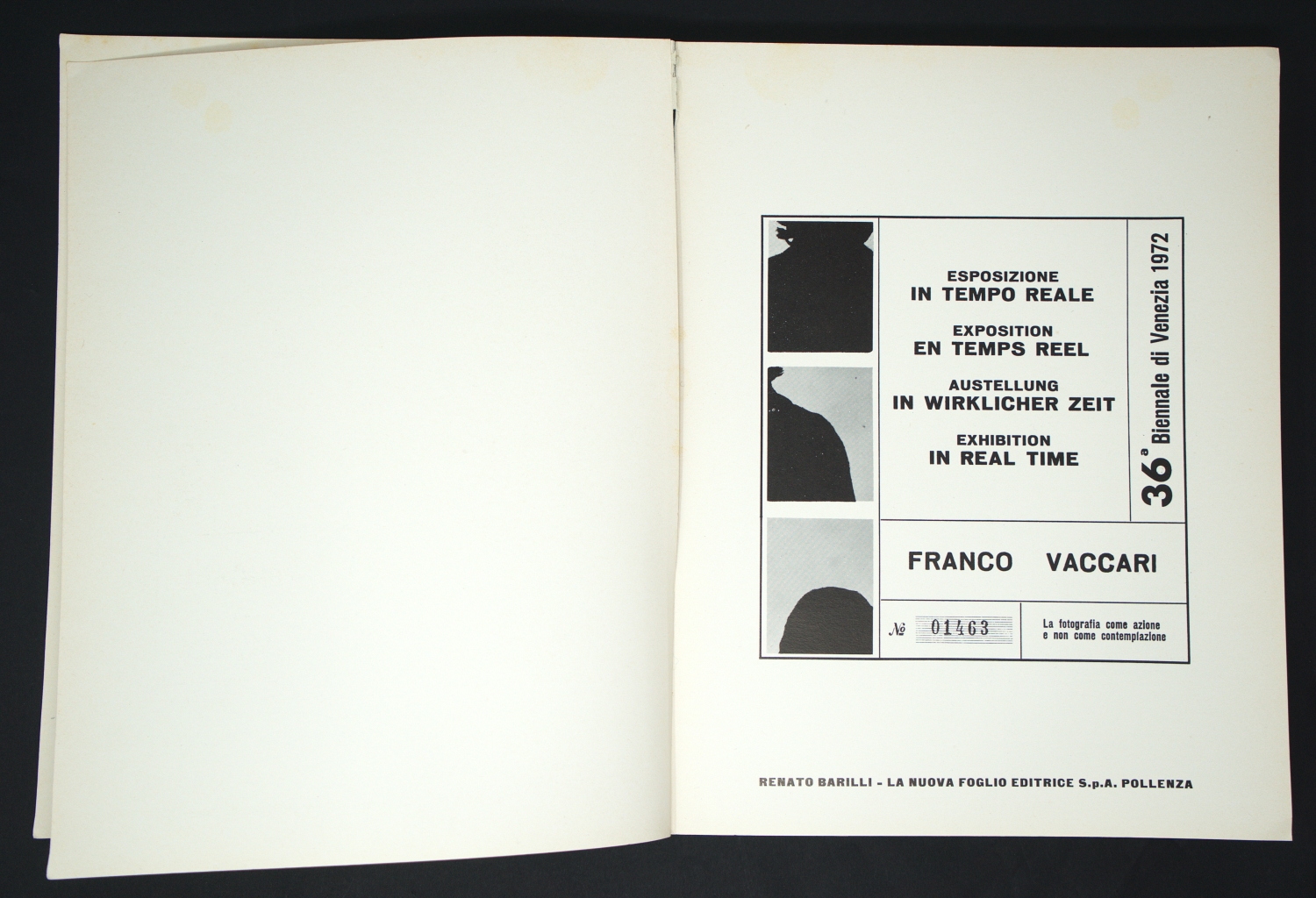 Vaccari, Franco. Esposizione in tempo reale. Exposition en temps réel. Ausstellung in wirklicher Zeit. Exhibition in Real Time. N° 01463. (Mit einem Vorwort von Renato Barilli). 170 Bl. Mit zahlreichen schwarz-weiß-Abbildungen. Farbig illustrierter OPappband (etwas fleckig und berieben) mit schwarzem Leinenrücken. Pollenza, La Nuova Foglio Editrice, 1972.