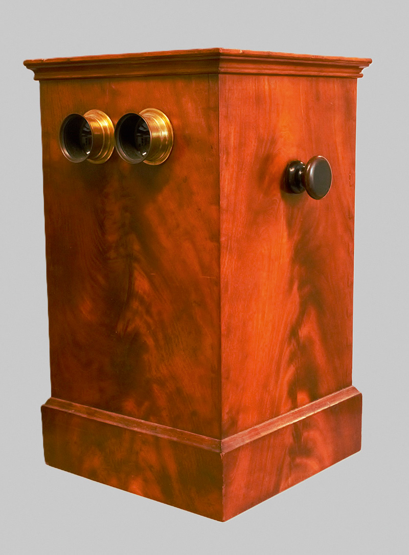 "Le Taxiphote"- Tisch-Stereobetrachter mit Nussbaumkorpus mit zwei Okularen in Metalleinfassungen, verso eine verglaste Klappe zur Einlage der Bildvorlagen, seitlich ein Kurbel-Drehknopf zur Justierung, oben klappbarer Deckel mit Scharnieren. Das Magazin ist im Inneren mit zahlreichen Stereo-Bildpaaren historischer Städteansichten gefüllt. Höhe: 44 cm, Länge: 26 cm, Breite: 26 cm. Wohl Deutschland, um 1910.