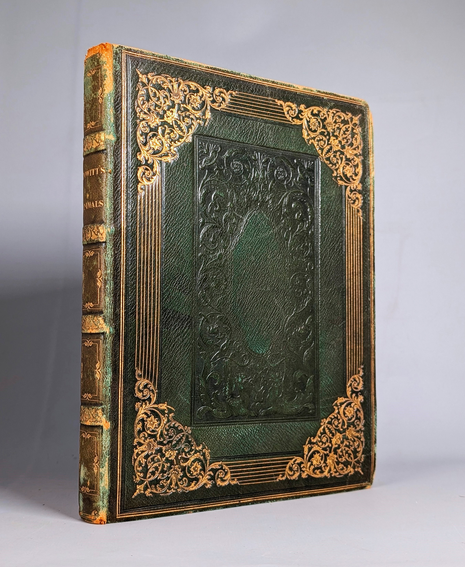 Howitt, Samuel. A new work of animals. Principal designed from the fables of Aesop, Gay, and Phaedrus: Containing fifty-six plates. 3 Bl. Mit 54 (von 56) Kupferstichtafeln. 26,5 x 20 cm. Grünes Maroquin d. Z. (etwas berieben und bestoßen sowie Kapitale mit winzigen Einrissen) mit golgeprägtem RTitel, goldgeprägten Deckeln, goldgeprägten Steh- und Innenkanten sowie dreiseitigem Goldschnitt. London, Edward Orme, 1811.