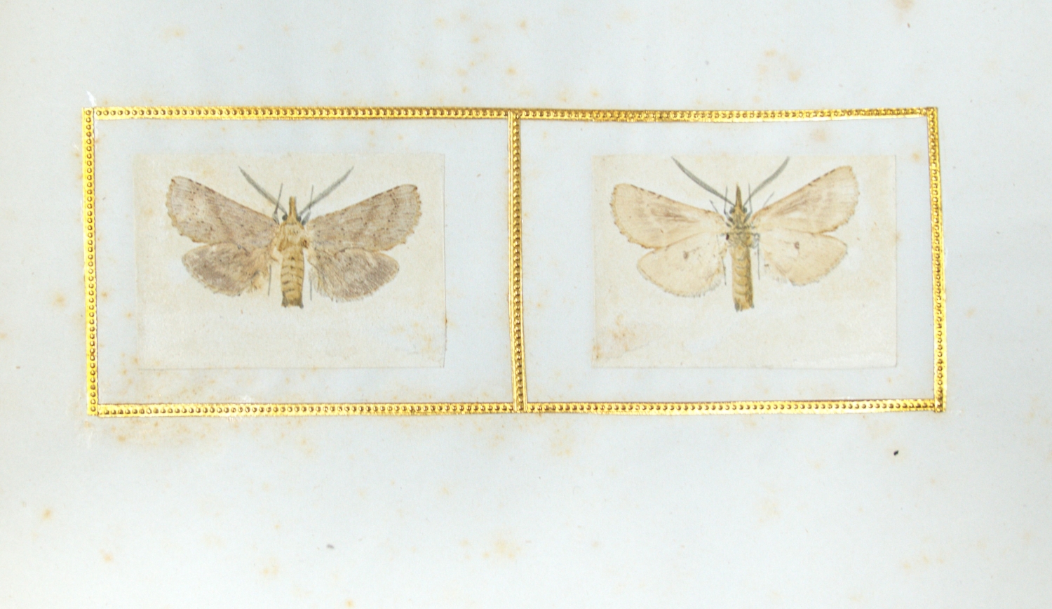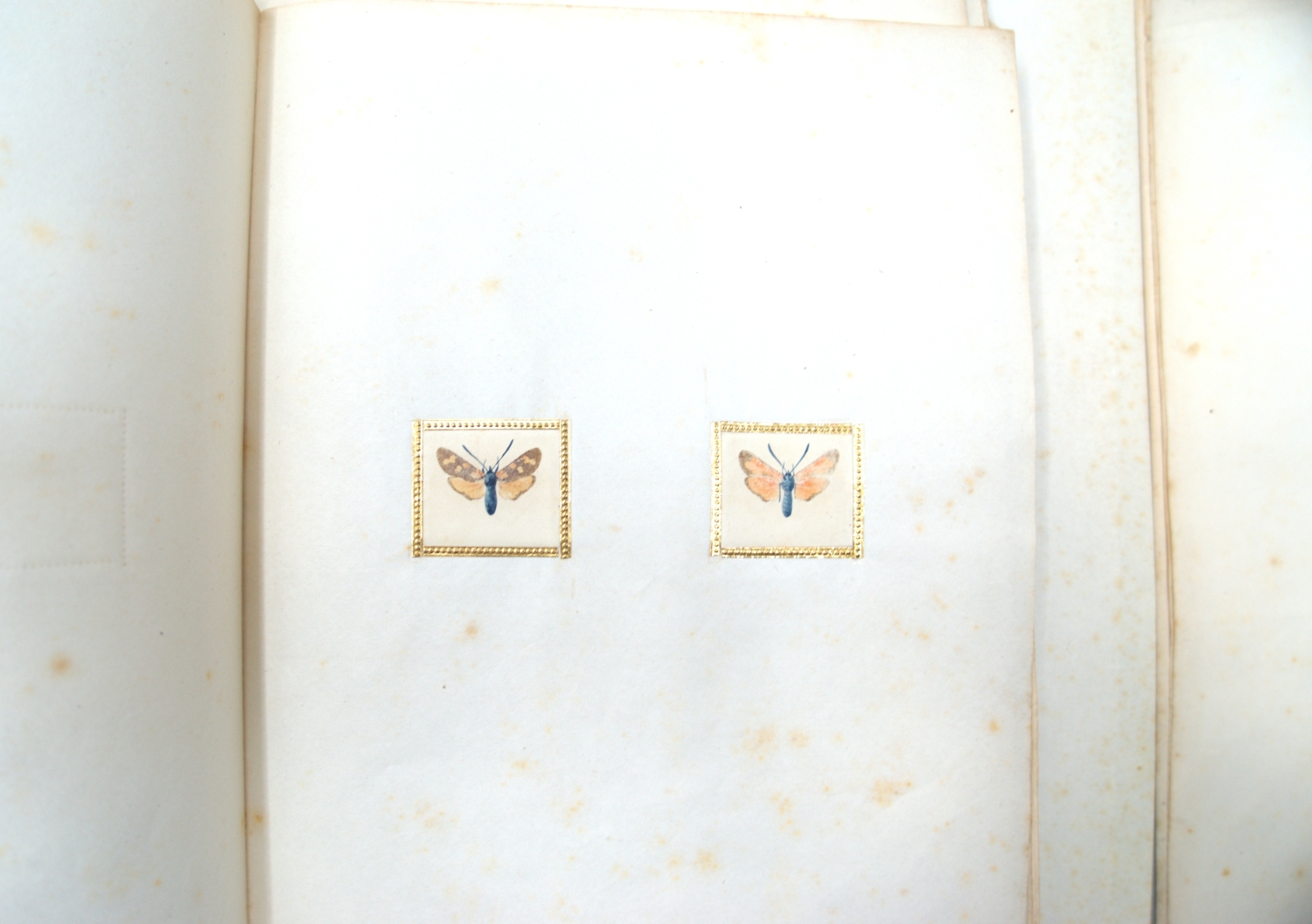 Umfangreiche Sammlung von ca. 135 naturgetreuen Darstellungen verschiedener Schmetterlinge und Motten, angelegt von einem kenntnisreichen Entomologen mit Hilfe des tierischen Naturselbstdrucks, bei dem durch Pressung von Insektenflügeln massstabsgetreue und überaus feine und detailgetreue Abbildungen der naturgegebenen Strukturen erreicht werden. Die Insektenkörper sind vom Druck ausgenommen und jeweils fein aquarelliert. Jeder Druck ist von einer geprägten Goldbordüre dekorativ eingefasst. Einige der Trägerblätter mit Gattungsbezeichnung, u. a. Pontia brassicae, Vanessa prorsa, Ennomus prunaria, Phlogophora meticulosa, Colias, Pygaera und Hylina. Format: ca. 2 x 3,5 bis 6,5 x 7 cm (Goldbordüre). – Trägerblätter stockfleckig, einige wenige auch mit stärkeren Quetschfalten und Knicken. Die minutösen Darstellungen nicht betroffen.