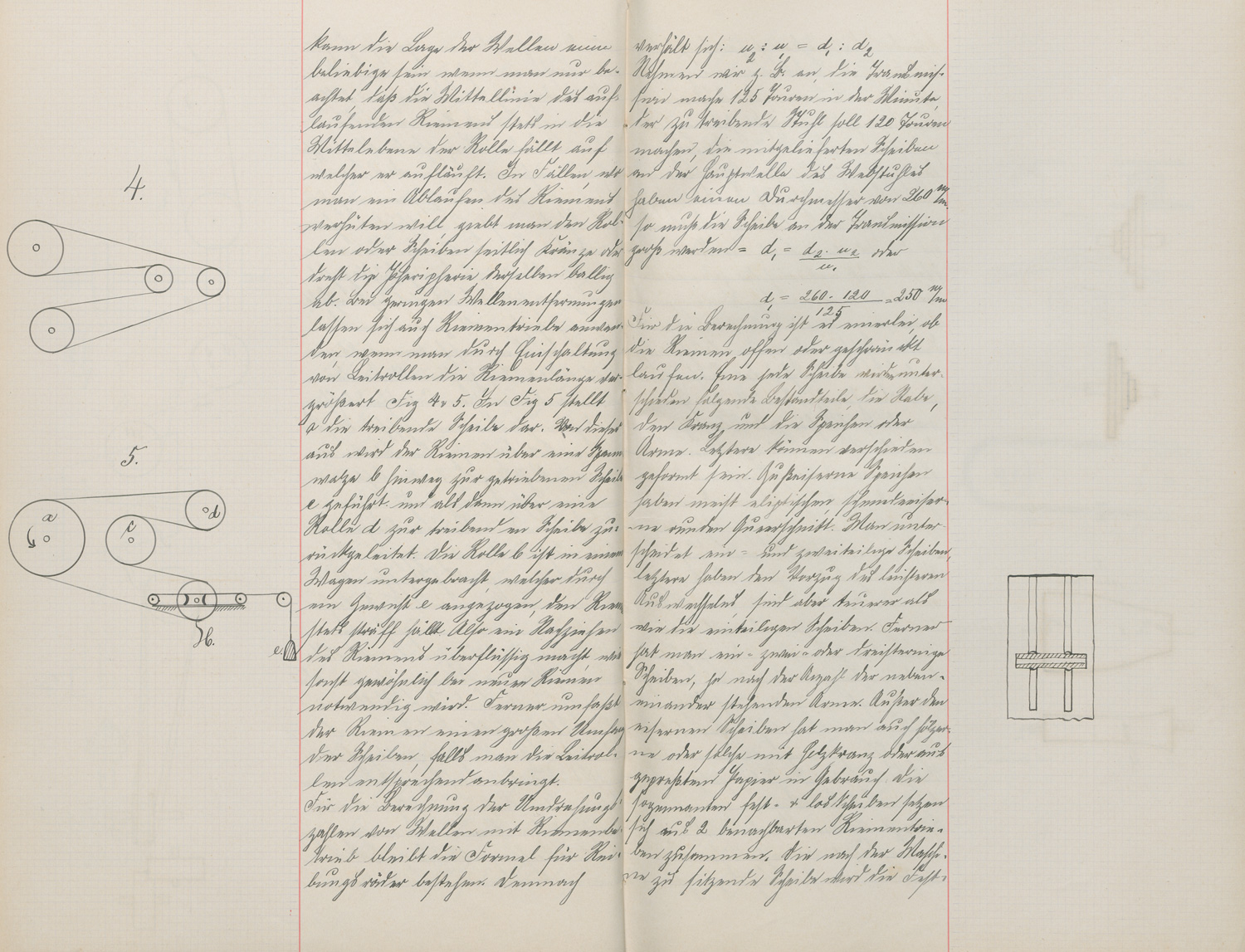 Maschinenelemente (darunter Schrauben, Nieten, Keile, Zapfen, Kuppelungen, Riemenscheiben, Zahnräder, Kolben, Absperrvorrichtungen), Spinnereimaschinen (darunter Ringspinnmaschinen, Das Zwirnen, Das Spinnen der Baumwolle, Die Schlagmaschinen, Das Kratzen oder Krempeln, Das Feinspinnen), Mechanische Webstühle, Der Flachs, Vorbereitungsmaschinen, Motoren und Appreturmaschinen sowie weitere textiltechnische Themen. – Saubere und gut lesbare Handschrift. Einige Zeichnungen mit leichtem Durchschlag, insgesamt wohlerhalten.