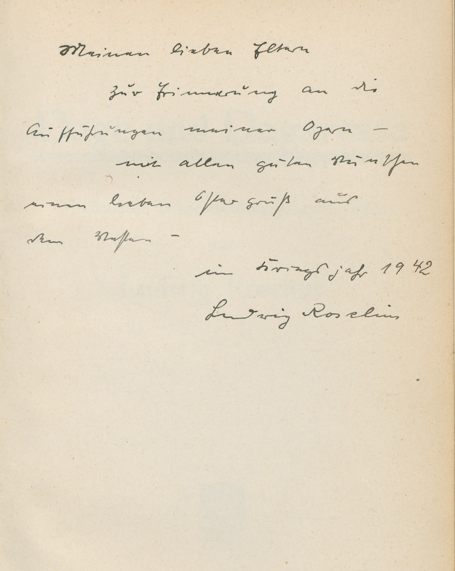 Ludwig Wilhelm Roselius (1902-1977) war ein deutscher Komponist, Musikkritiker und Dirigent. Unter anderem besuchte er die Kompositionsklasse bei Georg Schumann. – Mit 8-zeiliger Widmung des Autors auf dem Vorsatz. Innengelenke verstärkt, papierbedingt gebräunt, sonst gutes Exemplar.