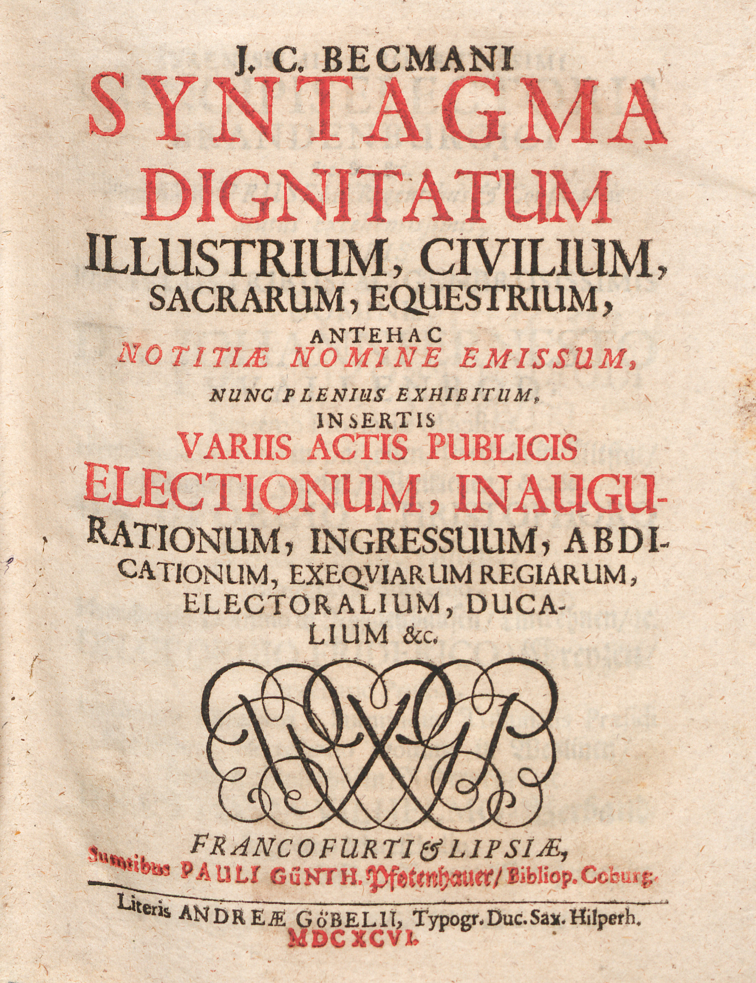 Becmann, Johann Christoph. Syntagma dignitatum illustrium, civilium, sacrarum, equestrium, antehac notitiae nomine emissum, nunc plenius exhibitum, insertis variis actis publicis electionum, inaugurationum, ingressuum, abdicationum, exequiarum regiarum, electoralium, ducalium. 5 Bl., 1494 (recte: 1498) S., 41 Bl. Titel in Schwarz und Rot. 20 x 1 6 cm. Pergament d. Z. Frankfurt und Leipzig, Andreas Göbel für Paul Günther Pfotenhauer, 1696.