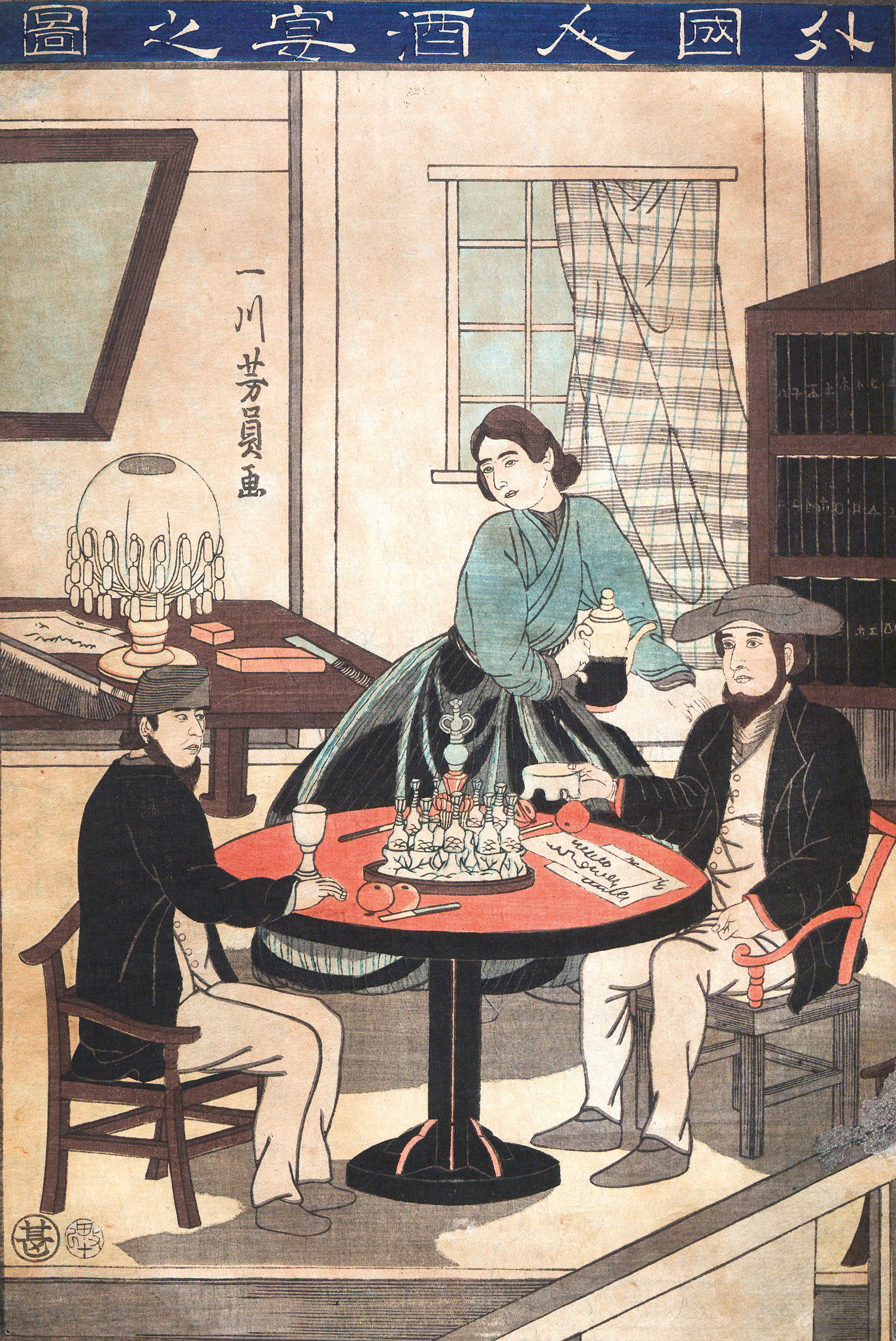 II. Gaikokujin shû’en no zu (japonice: Bild von Ausländern bei einem Trinkgelage - ein kleines Bankett). – Papierbedingt gebräunt. Mit leichten Abriebstellen und Lagerspuren.